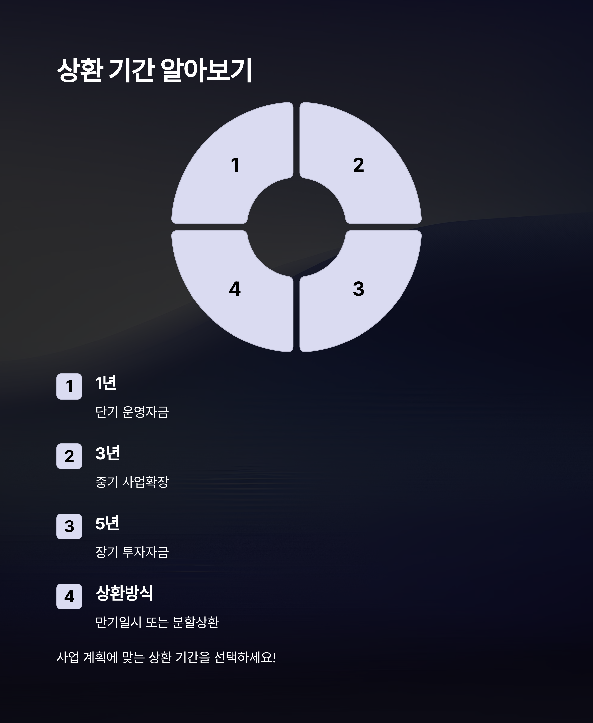 1년에서 5년까지 다양하며, 상품에 따라 만기 일시상환 또는 원리금 분할상환 방식이 있습니다.