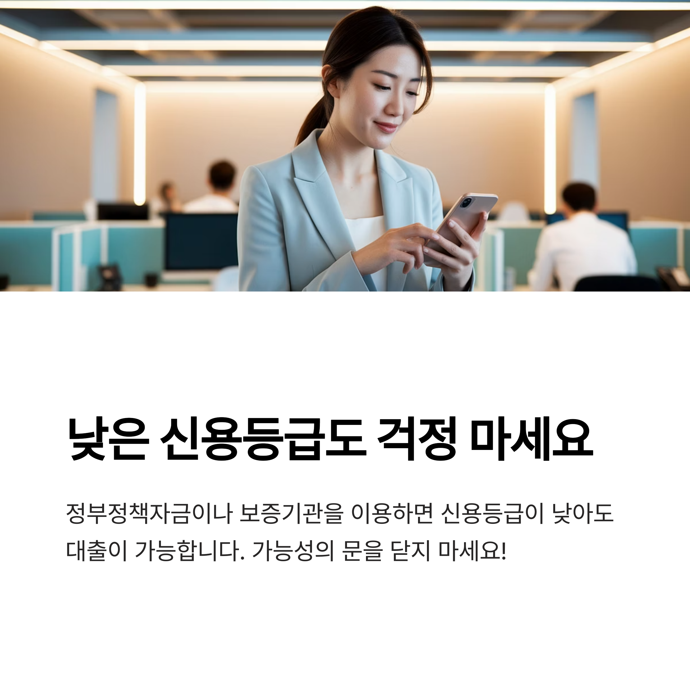 정부정책자금이나 보증기관 이용 시 신용등급이 낮아도 대출이 가능합니다.