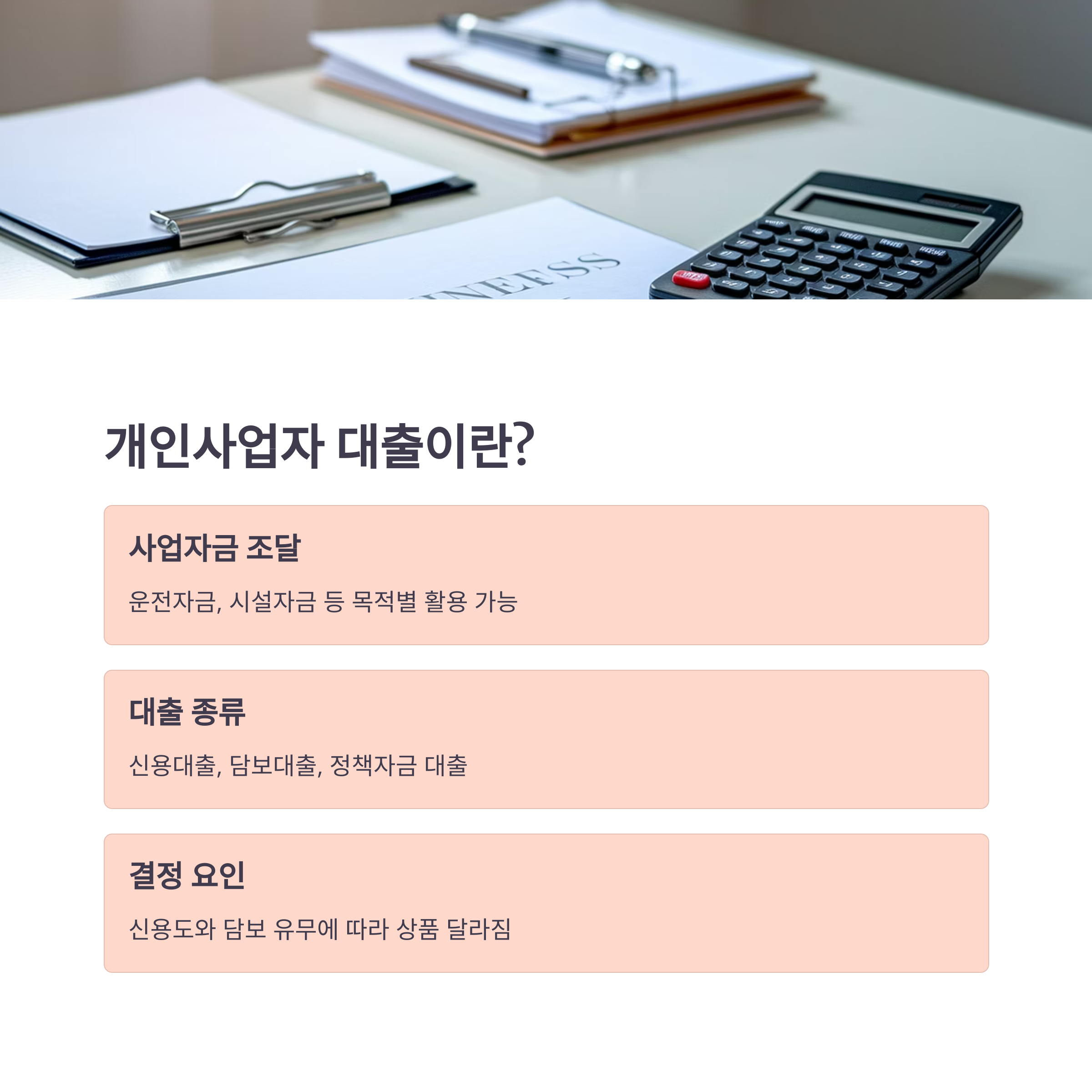 개인사업자 대출은 사업 운영에 필요한 자금을 개인사업자 명의로 조달할 수 있는 대출 상품입니다. 운전자금, 시설자금 등 자금 목적에 따라 다양하게 활용 가능하며, 신용도나 담보 유무에 따라 상품 종류가 달라집니다.