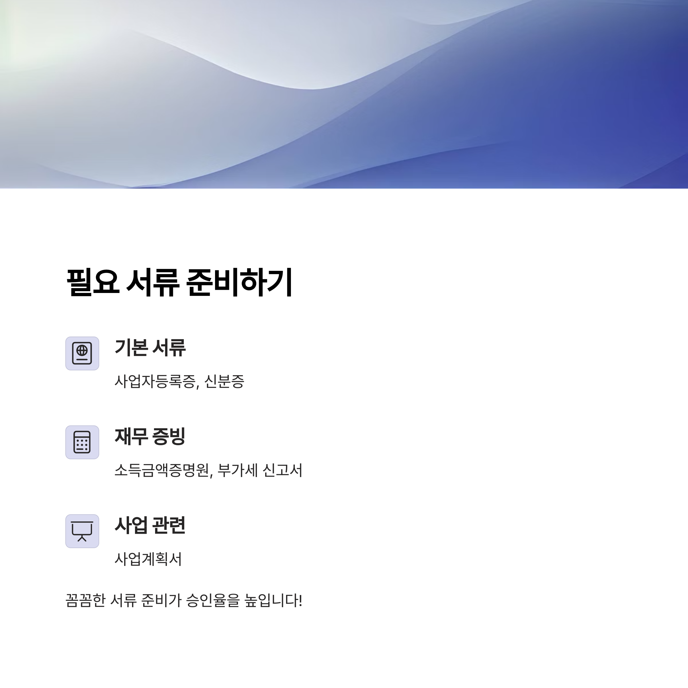 사업자등록증, 신분증, 소득금액증명원, 부가세 신고서, 사업계획서 등이 필요합니다.