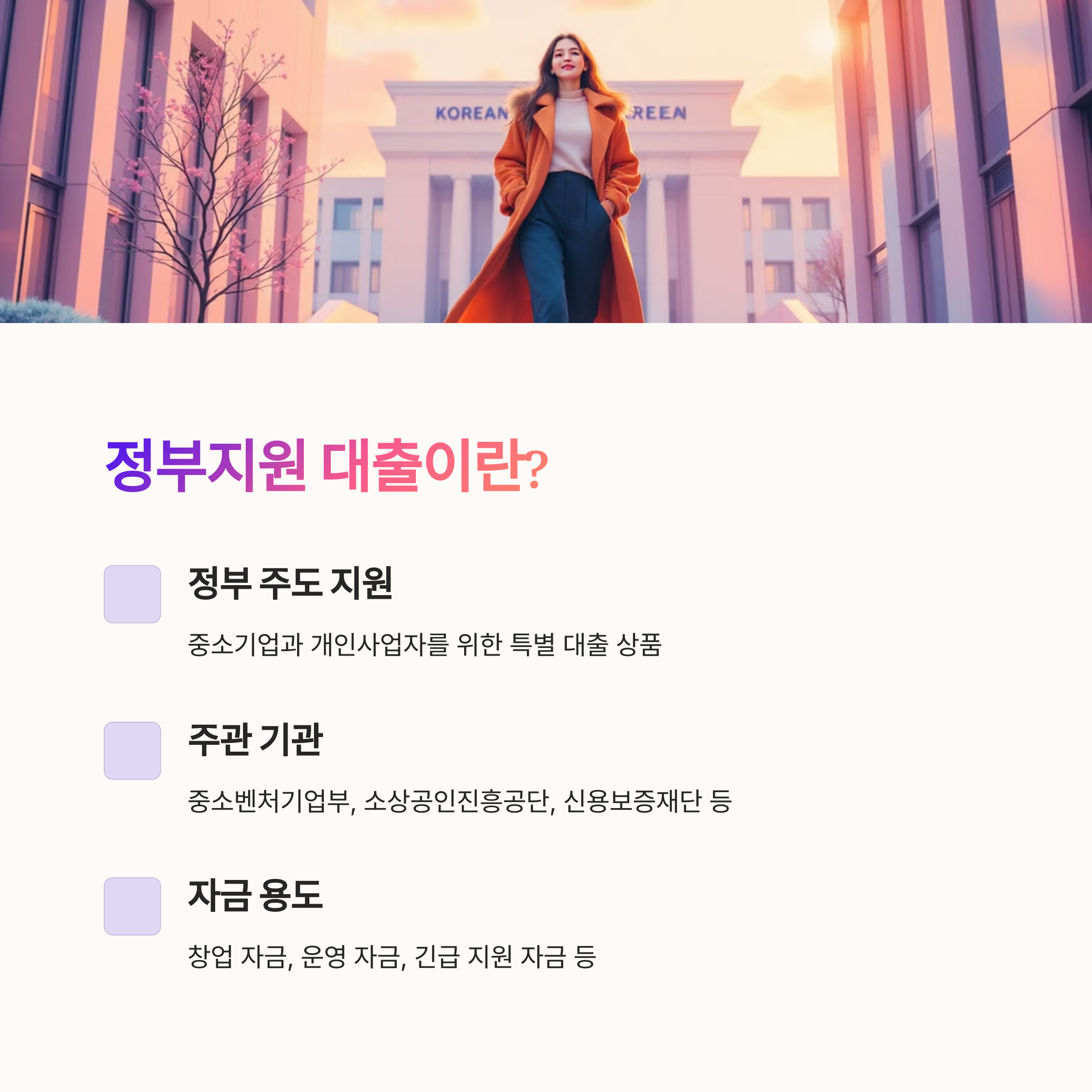 정부가 중소기업과 개인사업자를 지원하기 위해 낮은 금리와 완화된 심사 기준을 적용하여 제공하는 대출 상품입니다. 보통 중소벤처기업부, 소상공인진흥공단, 신용보증재단 등의 기관이 주관하며, 창업 자금, 운영 자금, 긴급 지원 자금 등으로 구분됩니다.