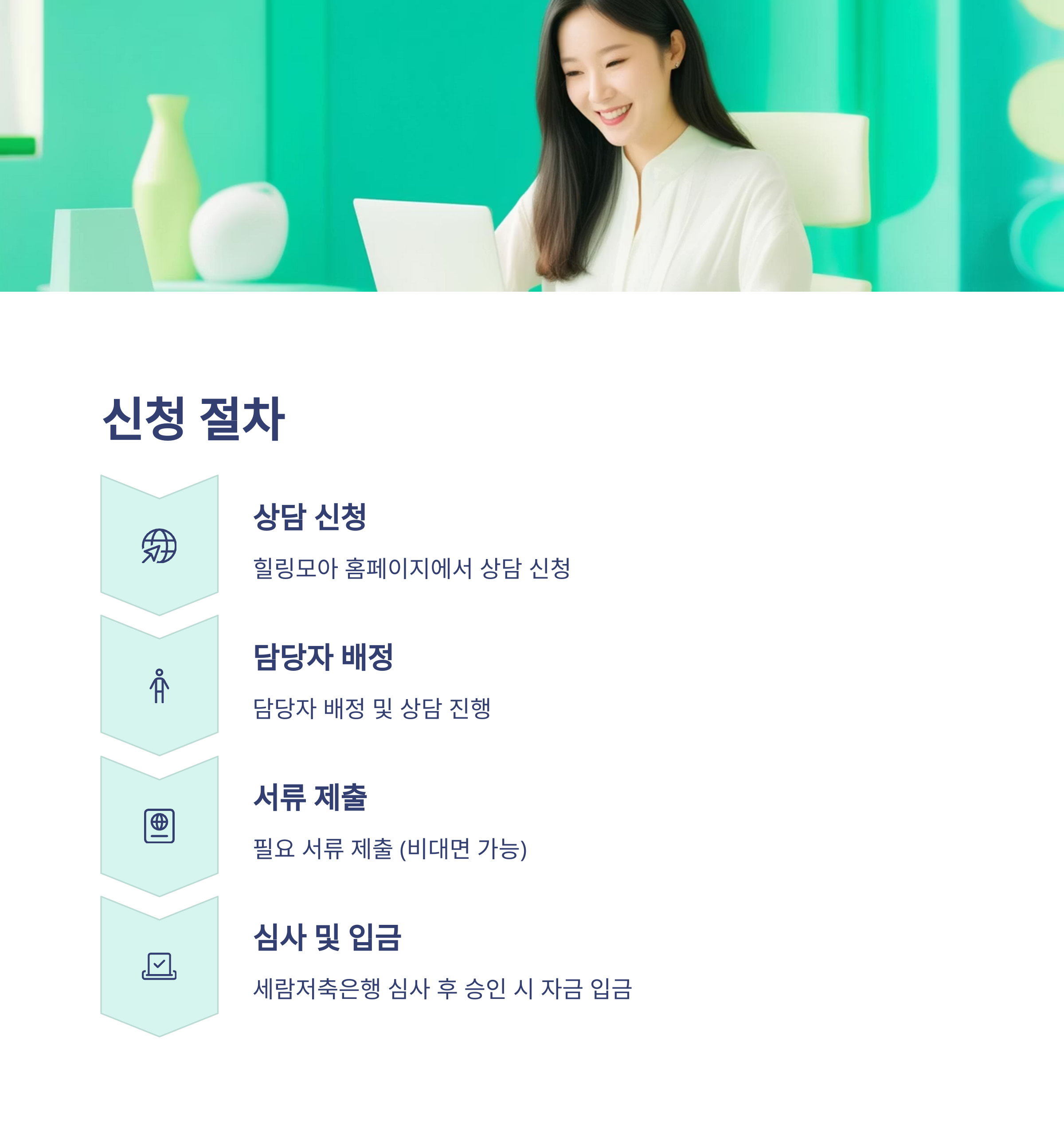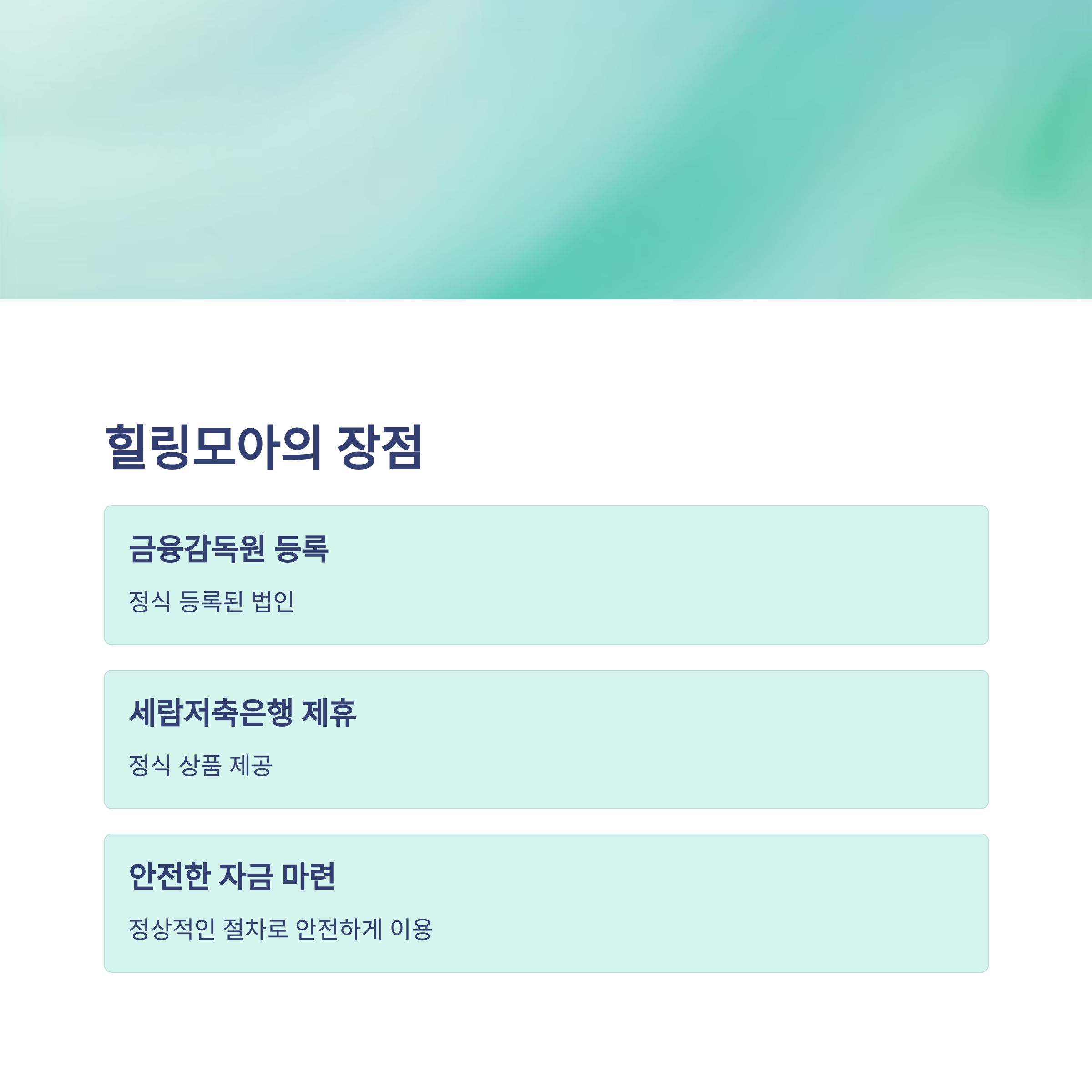 힐링모아는 금융감독원 등록 법인이며, 세람저축은행과의 제휴를 통해 정식 상품을 제공하고 있으므로, 정상적인 절차와 상담을 통해 안전하게 자금을 마련하실 수 있습니다.