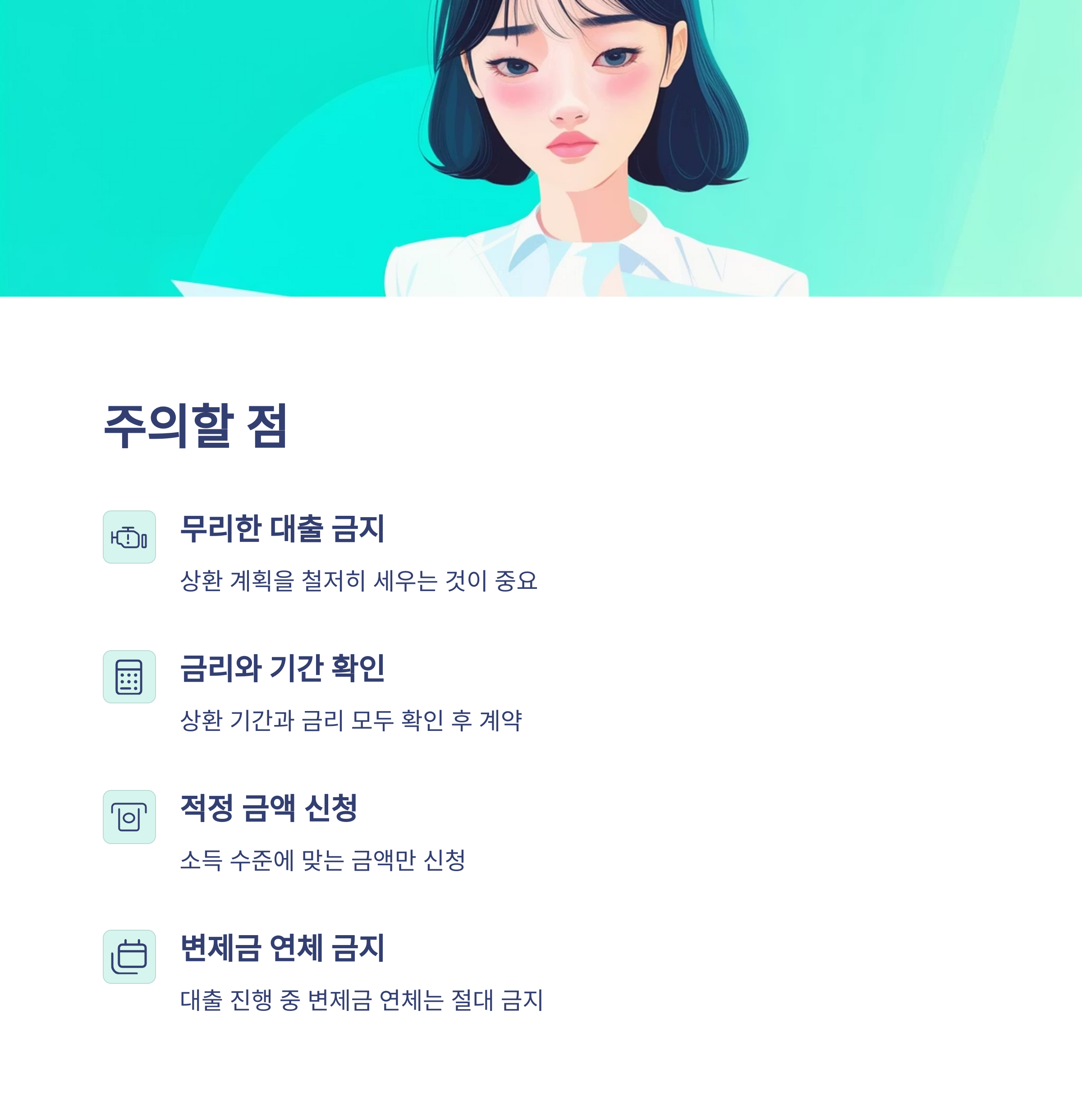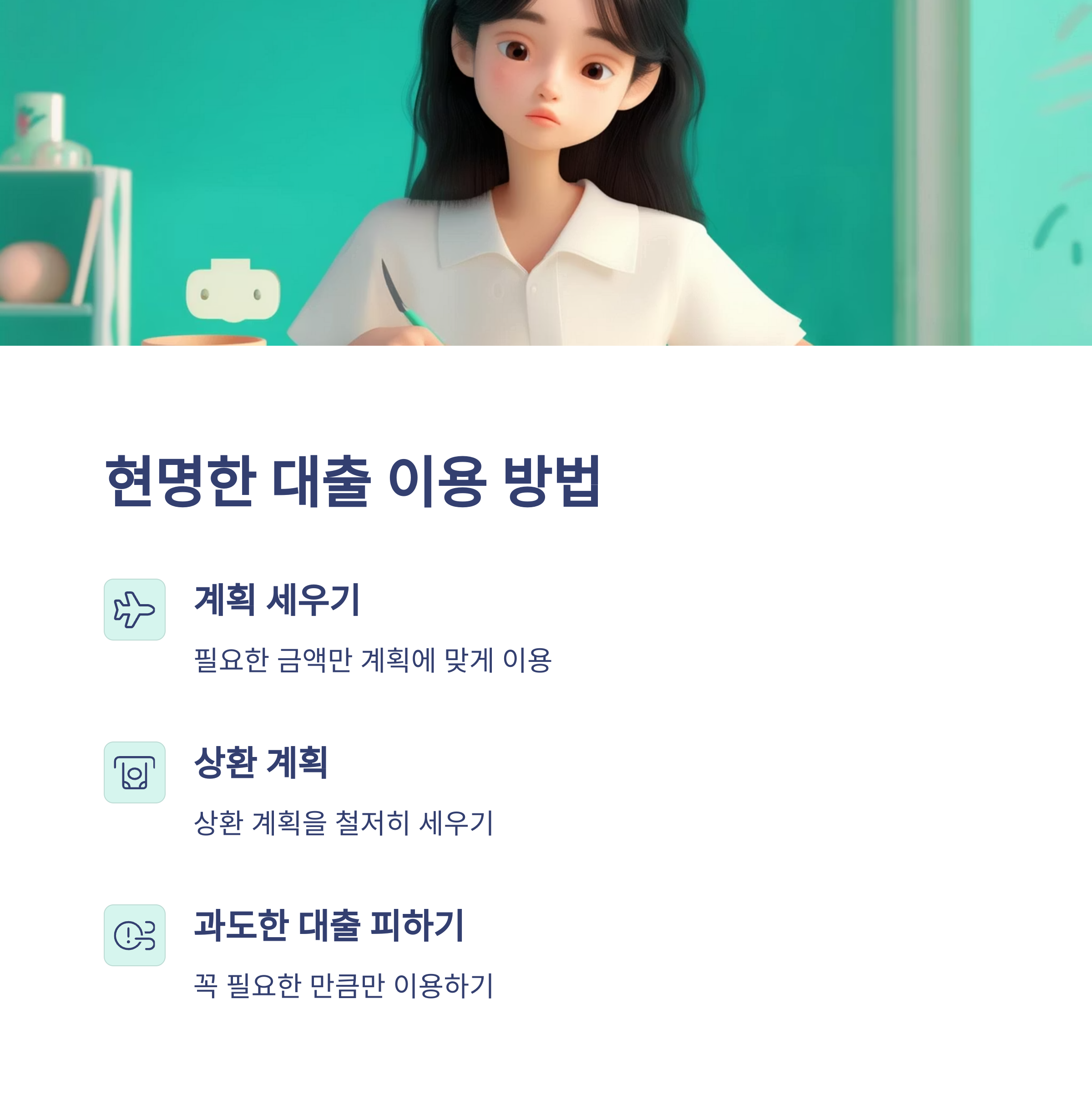 과도한 대출은 피하되, 필요한 만큼, 계획에 맞게 이용하시는 것이 중요합니다. 지금 바로 상담을 통해 본인의 상황에 맞는 해결책을 찾아보세요.