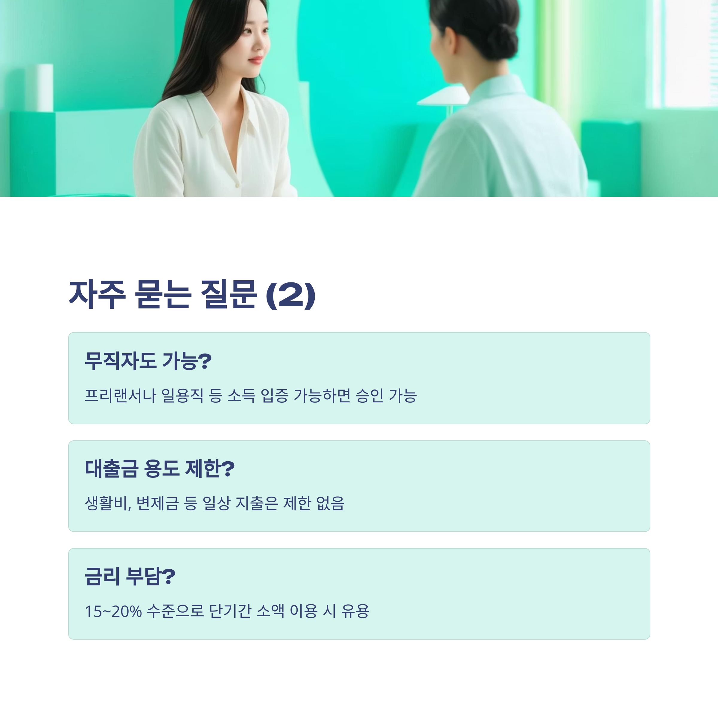 A6. 금리는 개인회생 특성상 15~20% 수준으로 다소 높은 편이지만, 단기간 소액 이용 시 신속한 자금 마련 수단으로 활용할 수 있습니다.