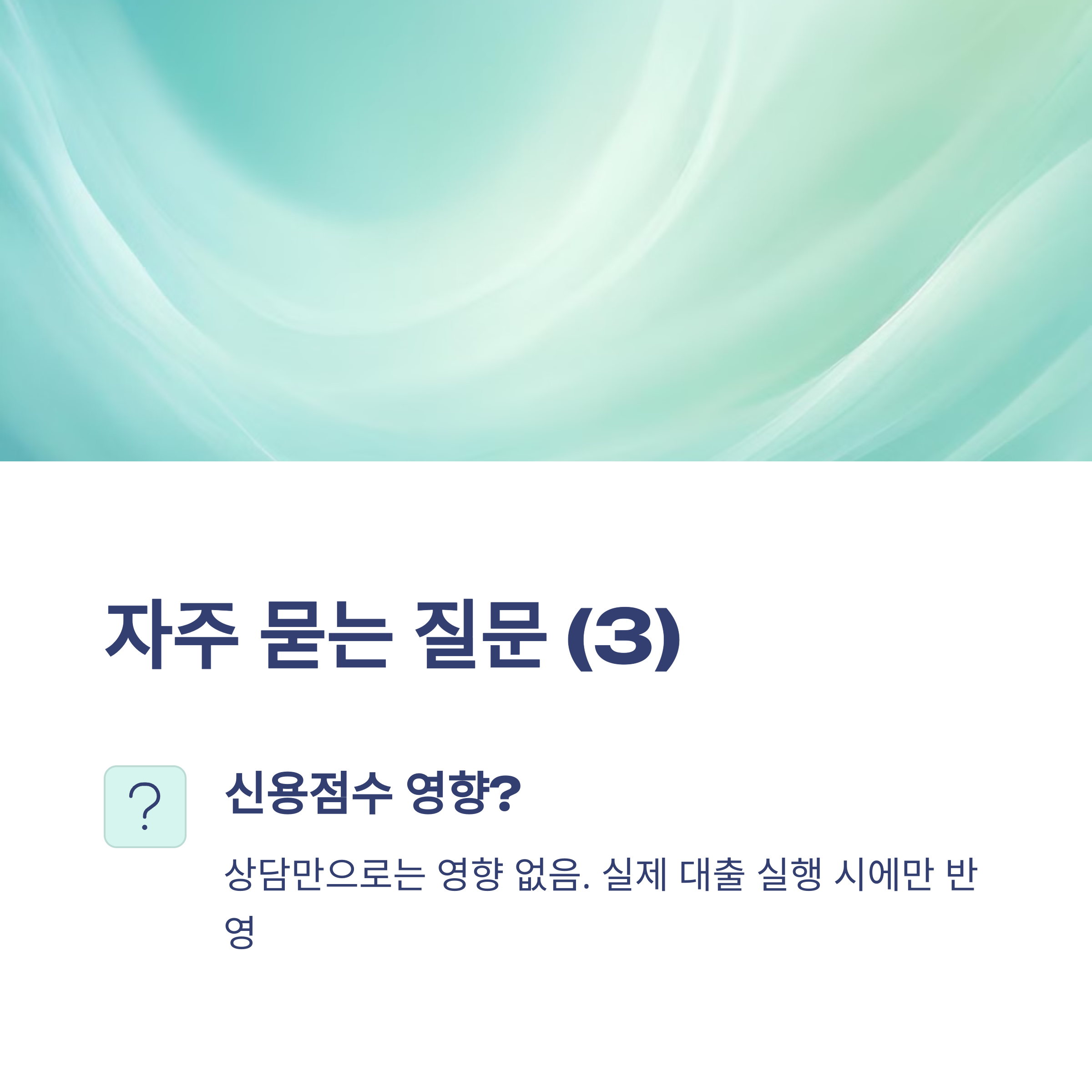 A7. 아닙니다. 가상 조회 및 상담만으로는 신용점수에 영향이 없습니다. 심사 통과 후 실제 대출 실행 시에만 신용기록이 반영됩니다.