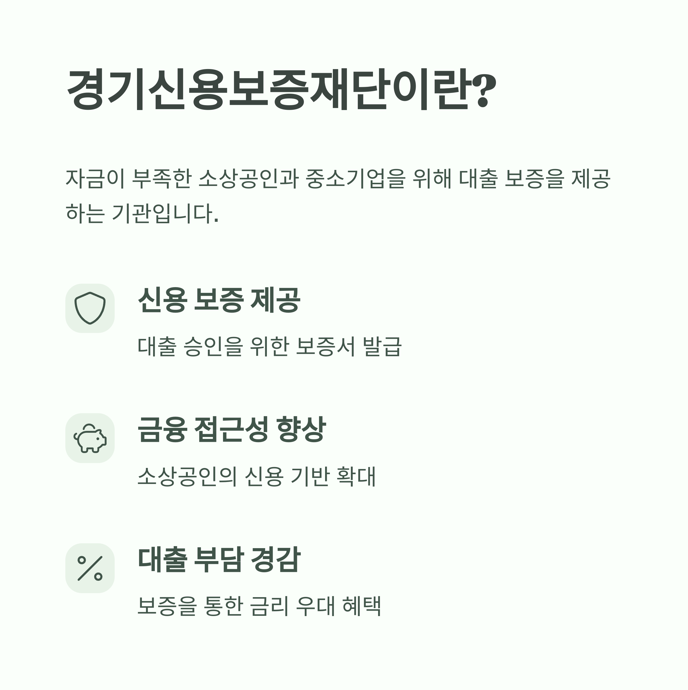 경기신용보증재단은 자금이 부족한 소상공인과 중소기업을 위해 대출 보증을 제공하는 기관입니다. 은행 대출이 어려운 사업자에게 신용보증서를 발급해주어, 금융기관의 대출 승인을 도와주는 역할을 합니다.