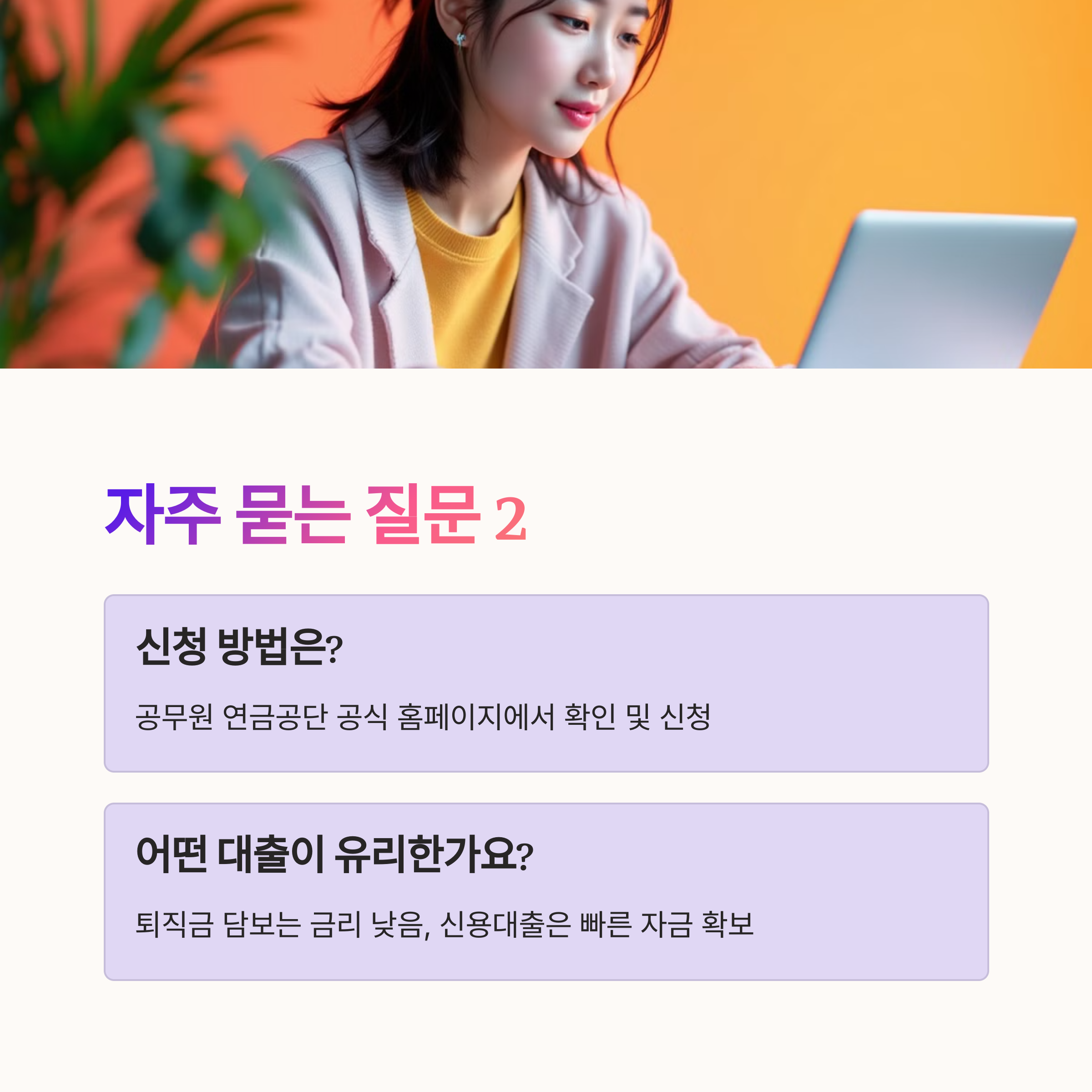 - 퇴직금 담보 대출 : 공무원 연금공단이 시중 금융기관과 협약을 맺어 퇴직금을 담보로 대출을 제공합니다.