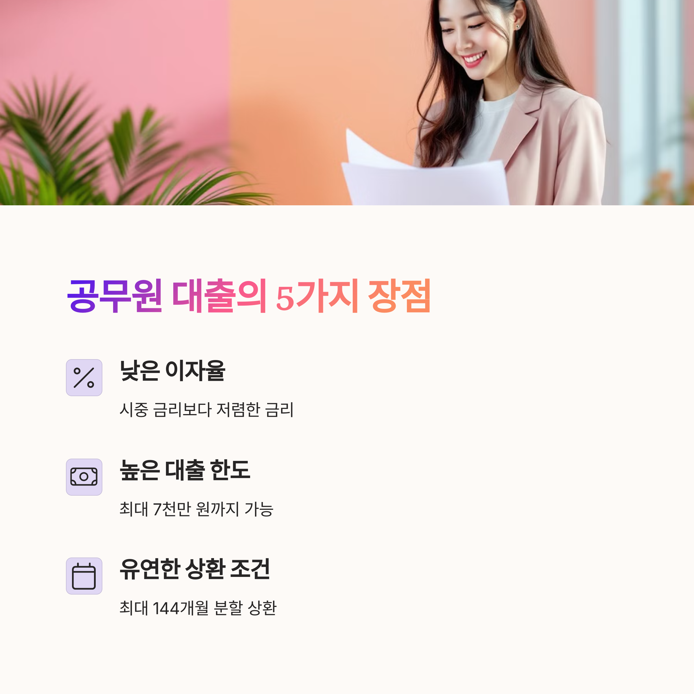 고금리 시대에도 공무원 대출은 낮은 금리와 높은 한도로 안정적인 금융 혜택을 제공합니다. 특히 최대 7천만 원 한도와 시중은행보다 낮은 금리로 대출을 받을 수 있는 기회를 놓치지 마세요!