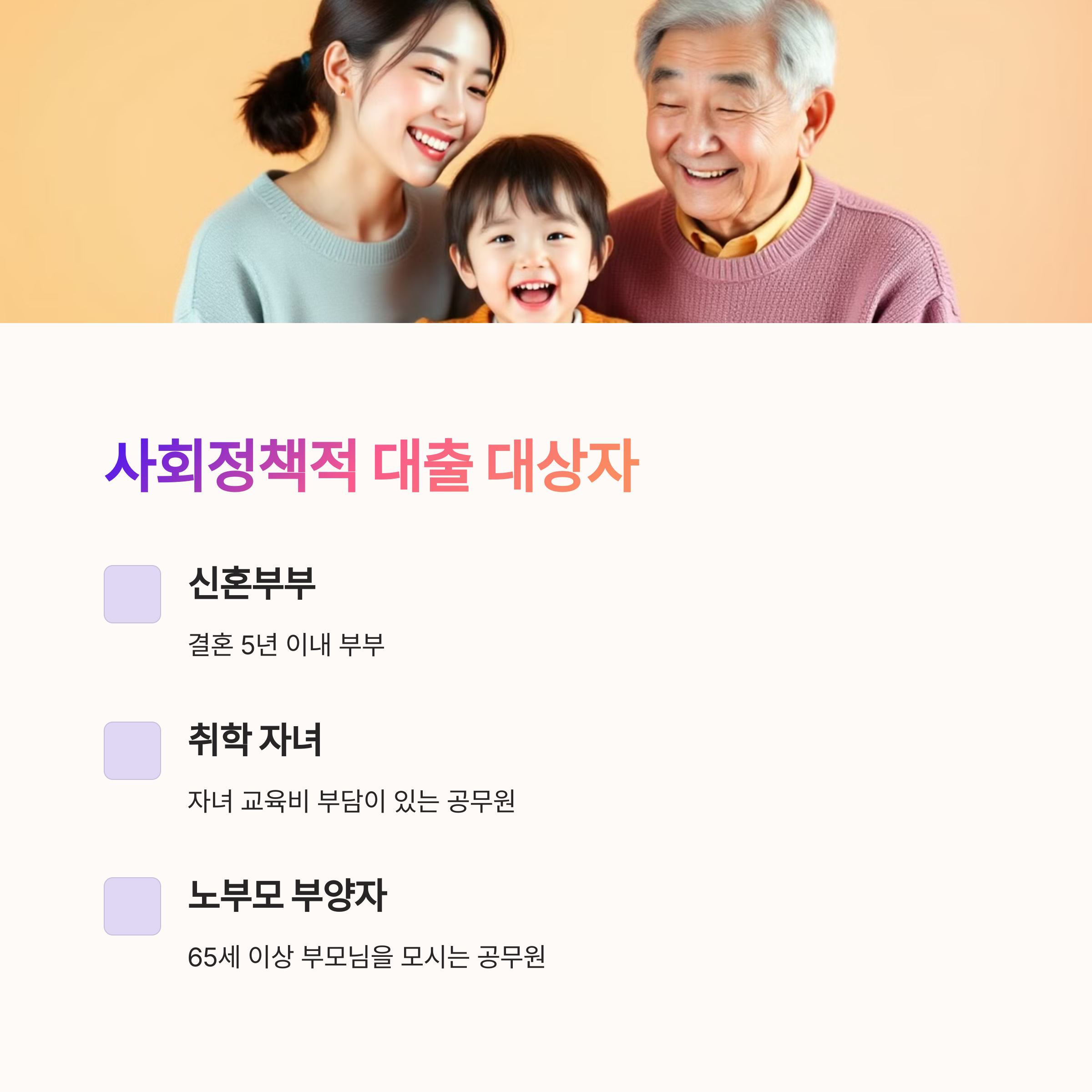 - 사회정책적 대출: 최대 3천만 원, 신혼부부·취학 자녀·노부모 부양자 대상