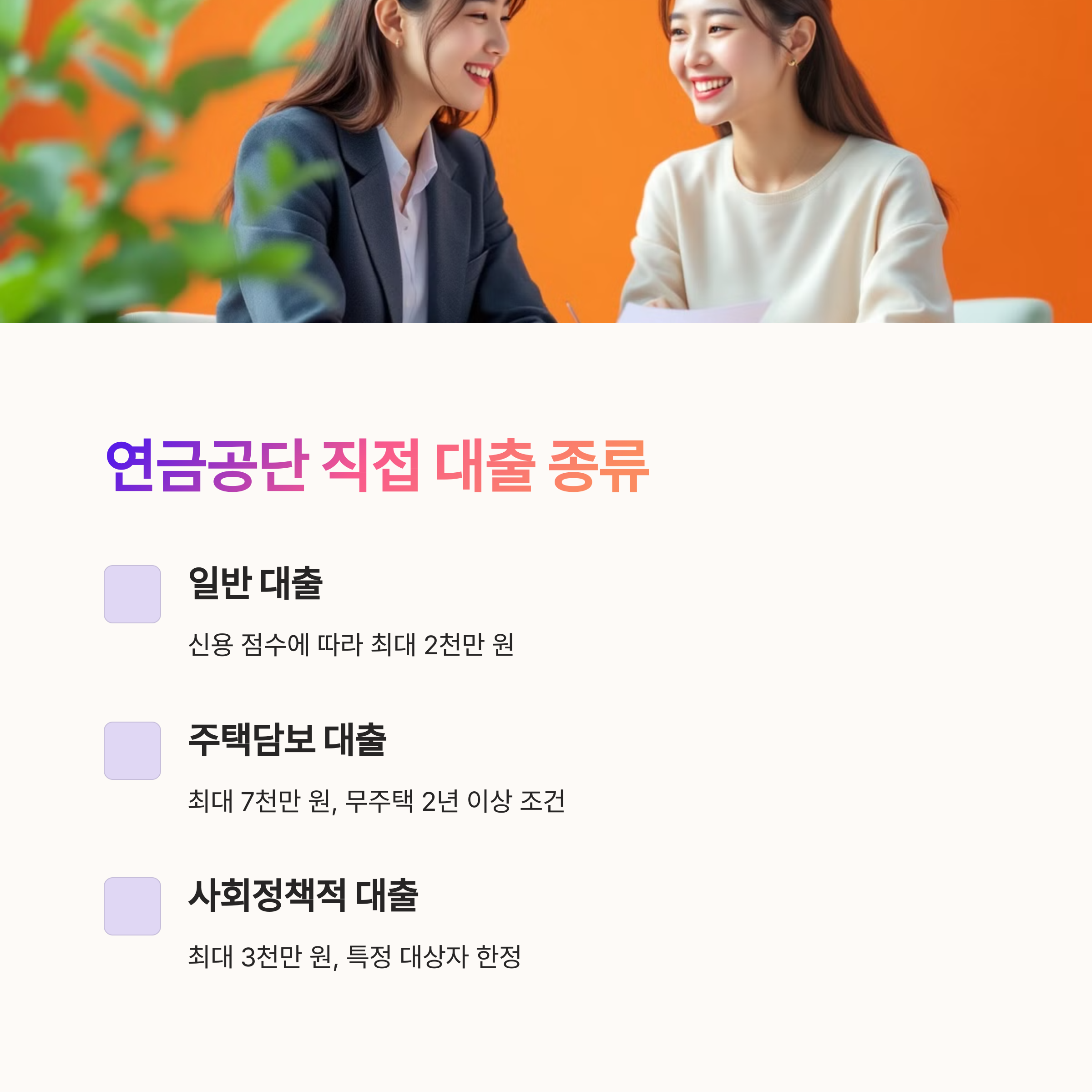 - 공무원 연금공단 직접 대출 : 연금공단이 직접 대출을 시행하며, 일정 조건을 충족하면 더욱 유리한 혜택을 받을 수 있습니다.