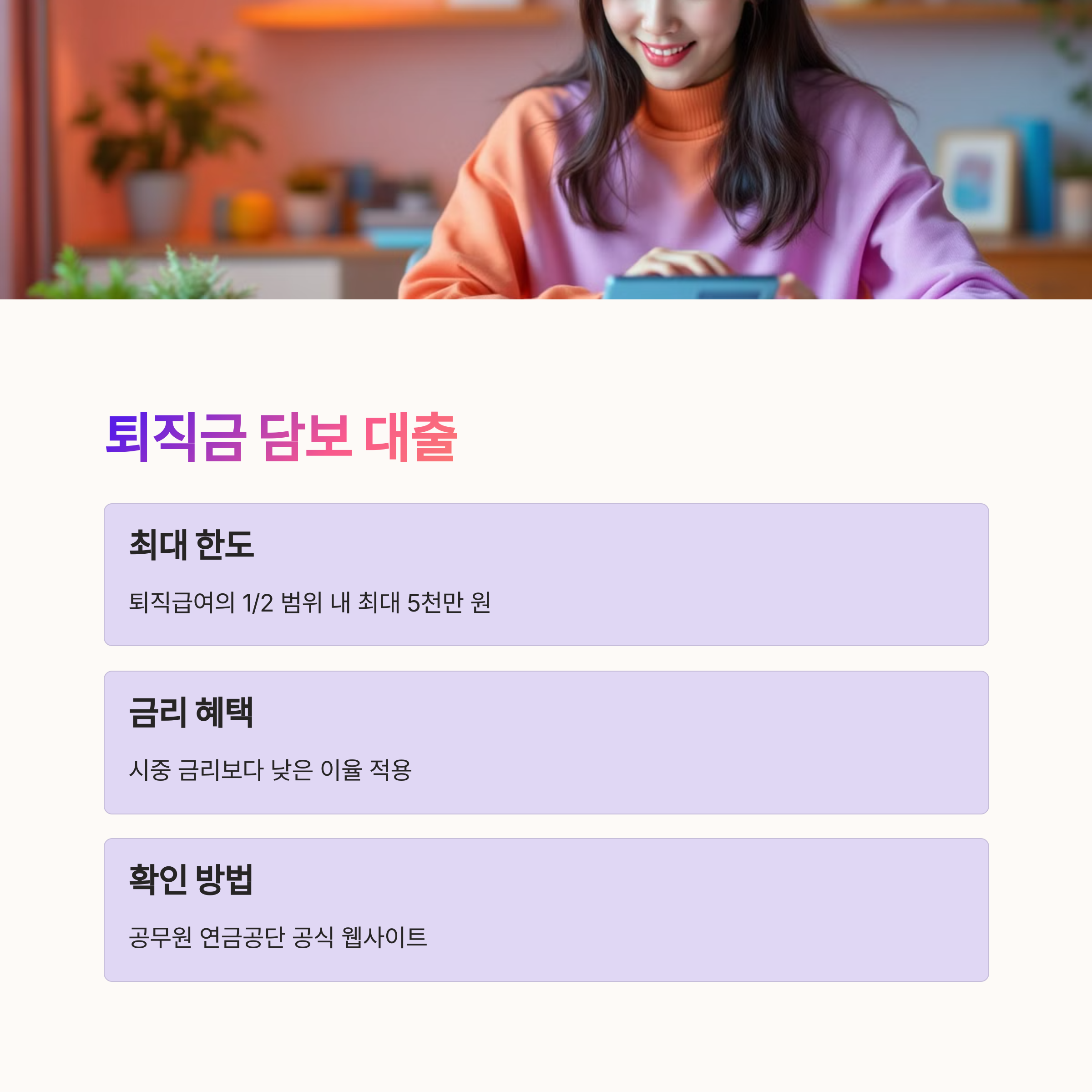 퇴직금 담보 대출은 퇴직급여의 1/2 범위 내에서 최대 5천만 원까지 대출을 받을 수 있는 제도입니다. 시중 금리보다 낮은 이율을 적용받을 수 있으며, 정확한 한도 및 금리는 공무원 연금공단 공식 웹사이트에서 확인이 가능합니다.