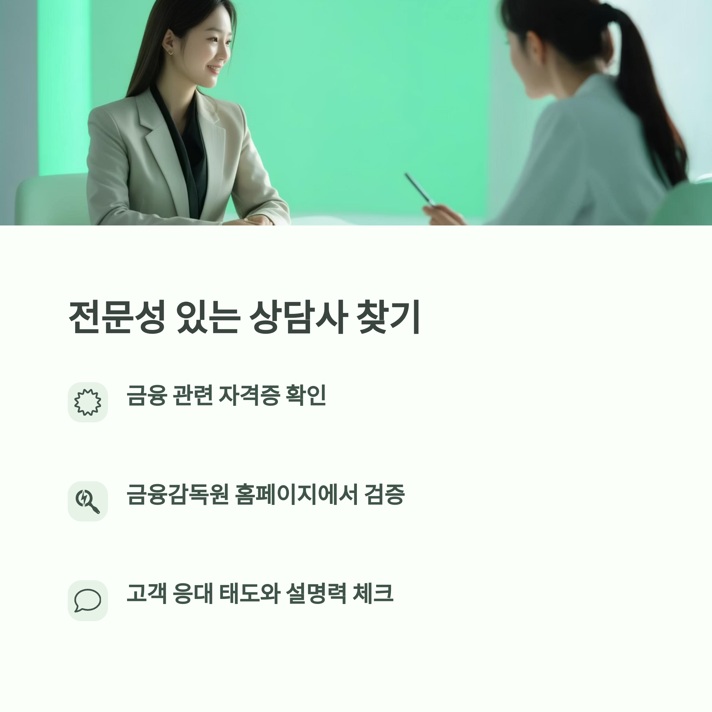 금융 관련 자격증(예: 금융투자자산관리사, 보험설계사, 대출상담사 자격 등)을 갖춘 전문가를 선택하세요.