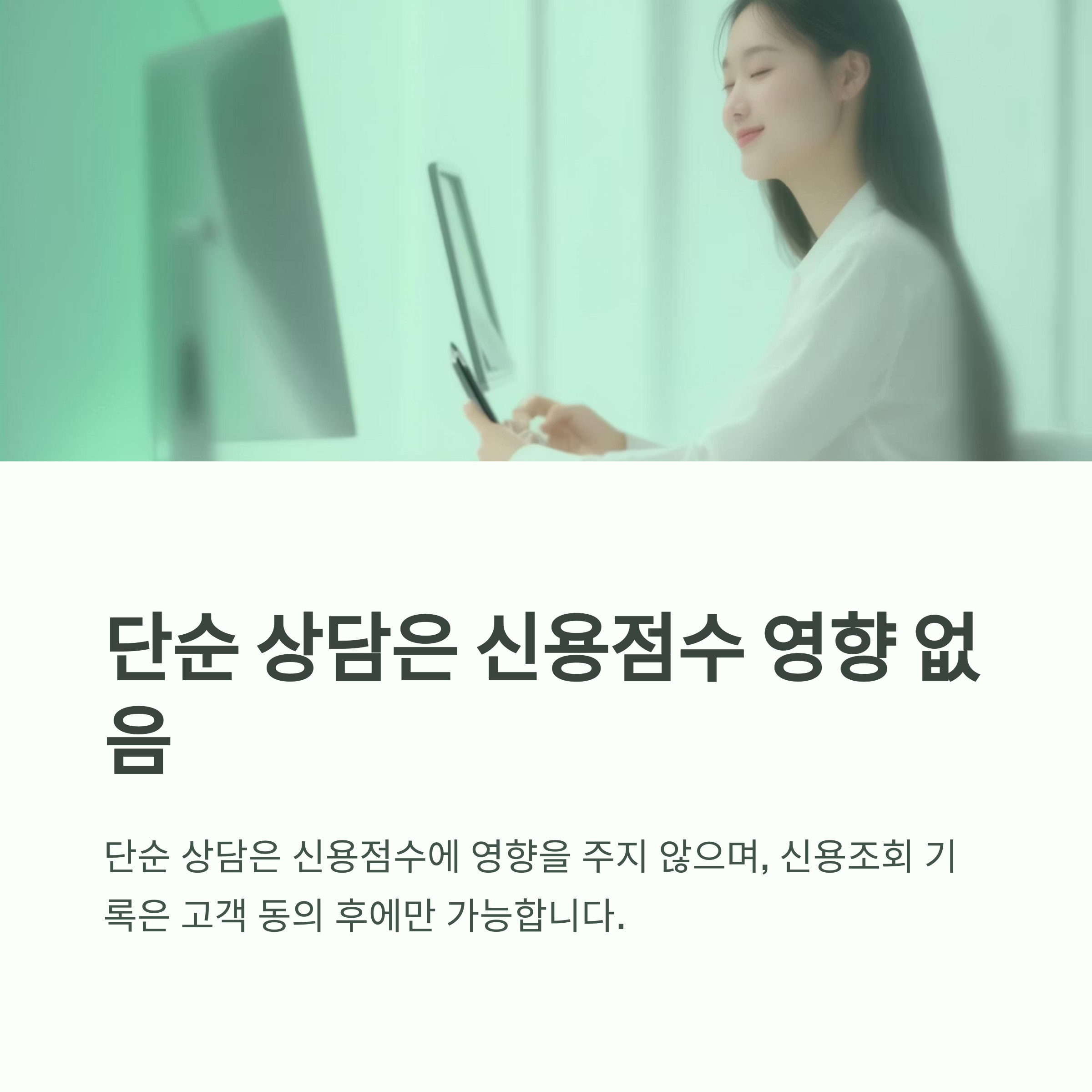 A3. 단순 상담은 신용점수에 영향을 주지 않으며, 신용조회 기록은 고객 동의 후에만 가능하도록 되어 있습니다.