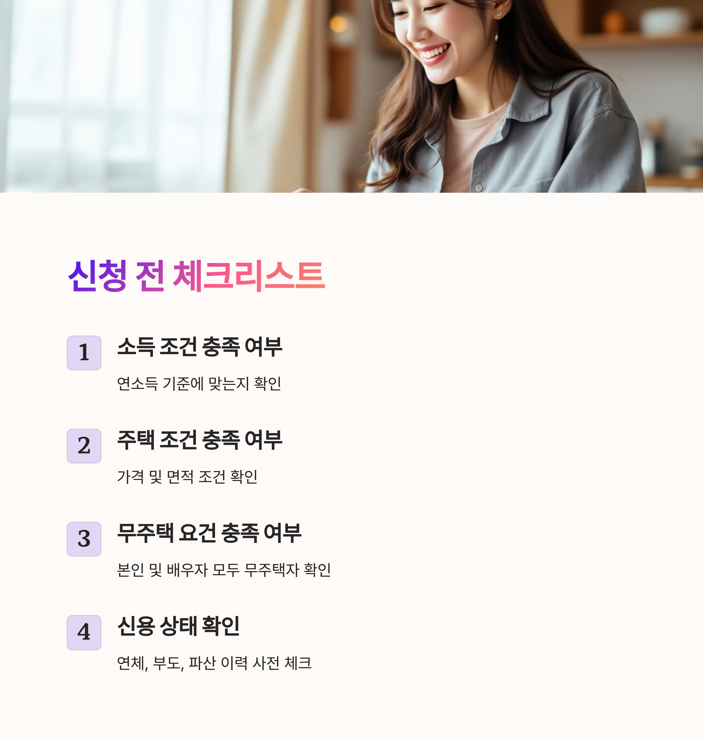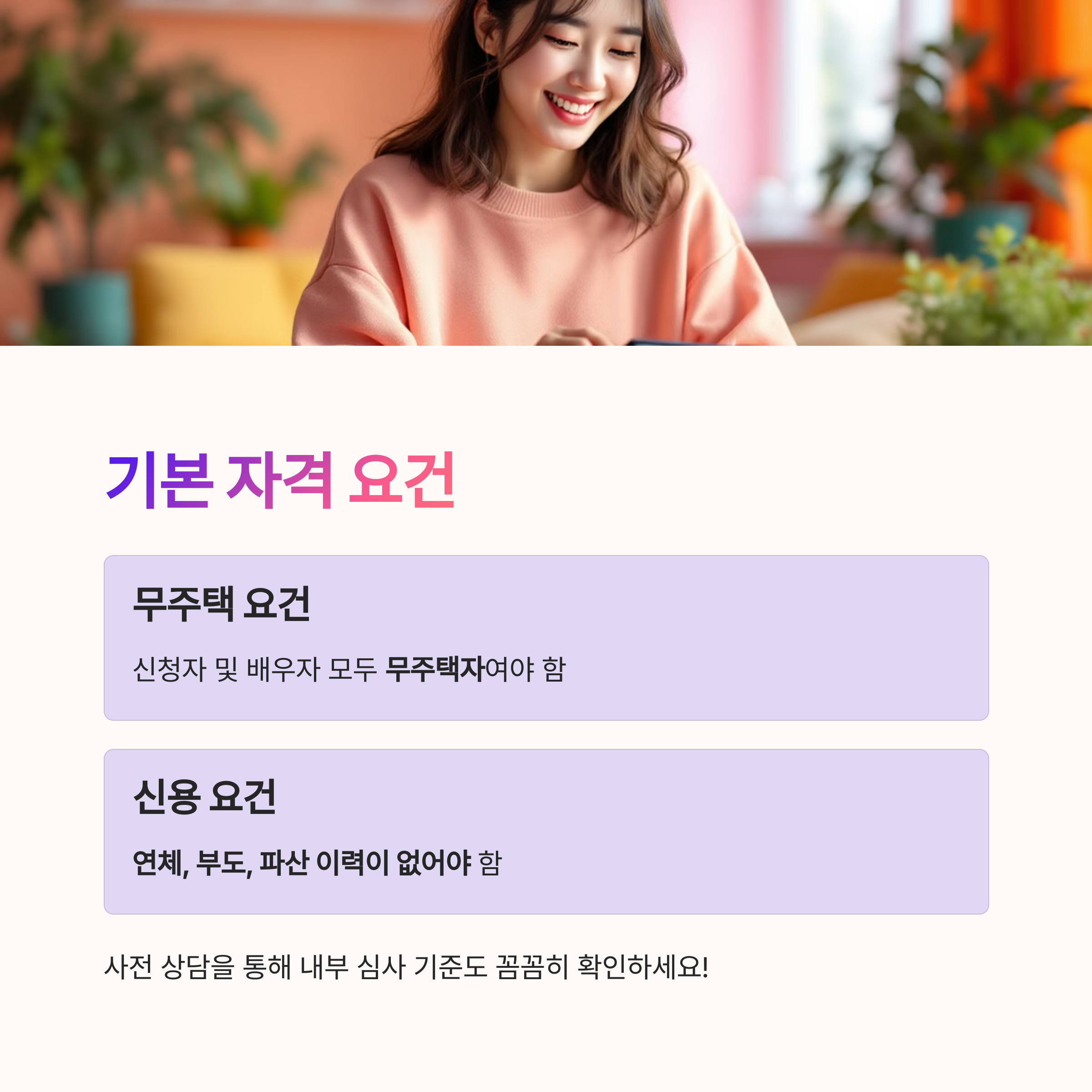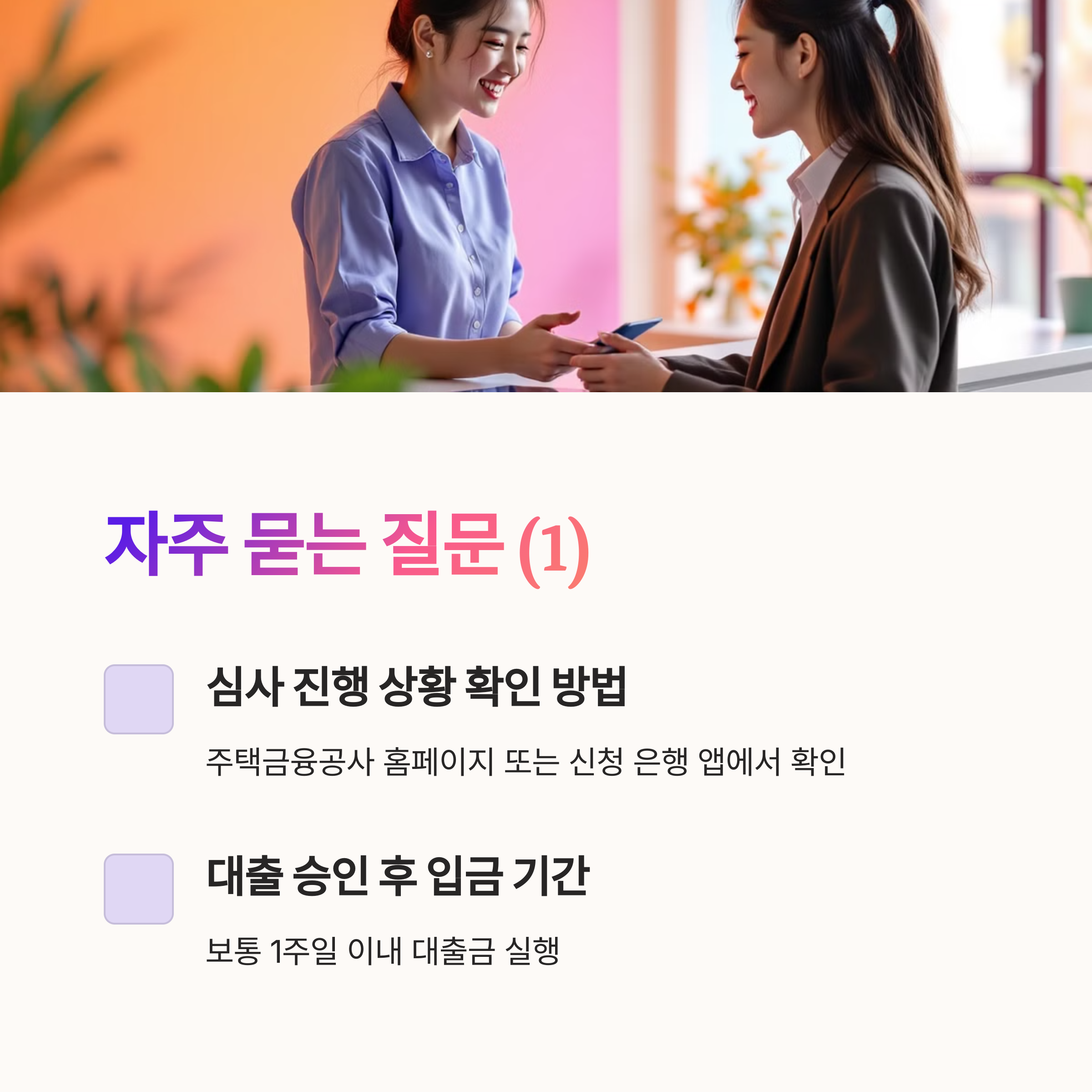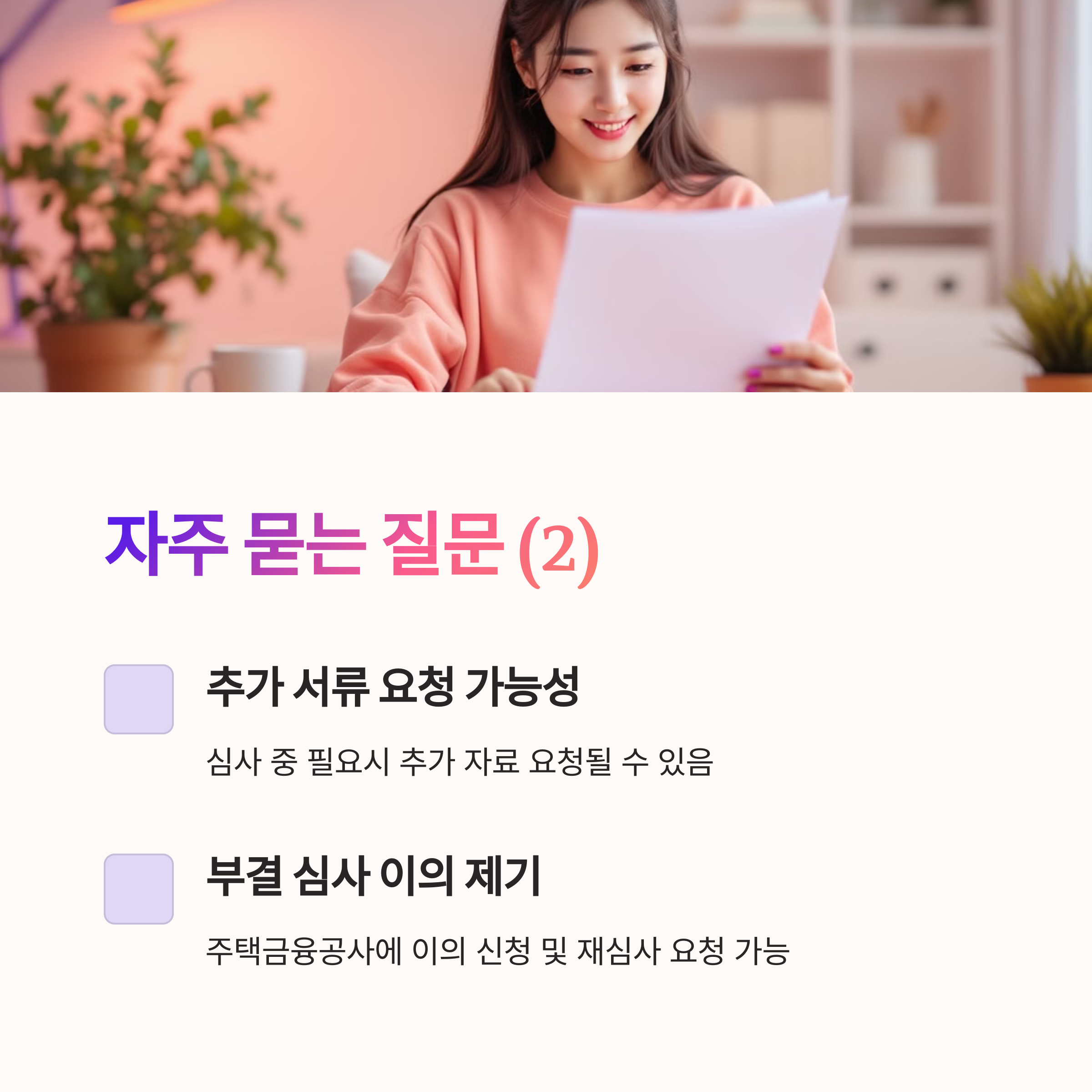 이 외에도 주택금융공사 내부 심사 기준이 추가 적용될 수 있으므로, 사전 상담을 통해 꼼꼼하게 확인하는 것이 중요합니다.