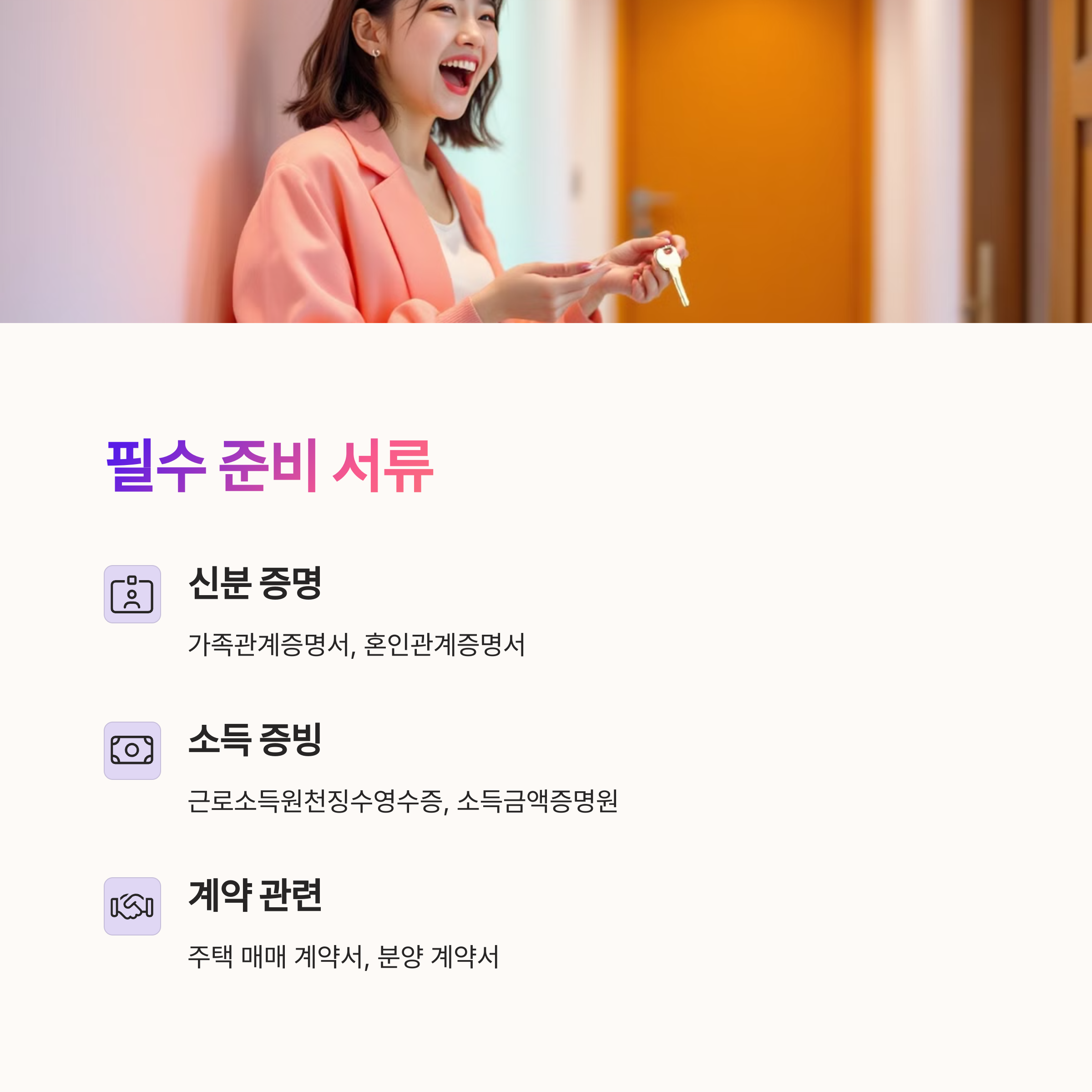- 가족관계증명서, 혼인관계증명서, 소득 증빙 서류, 주택 매매 계약서 등