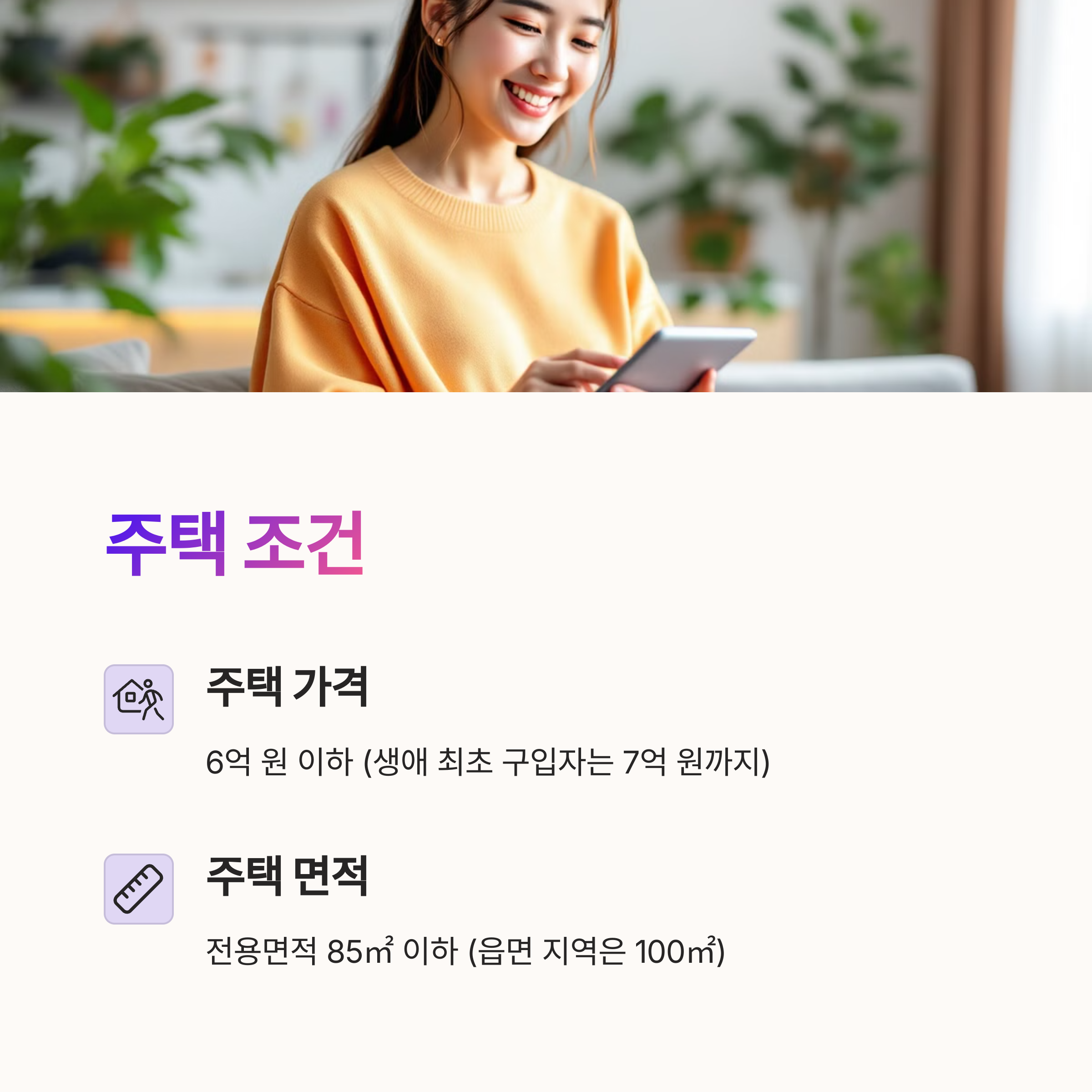 - 전용면적 85㎡ 이하 (읍면 지역은 100㎡ 이하)