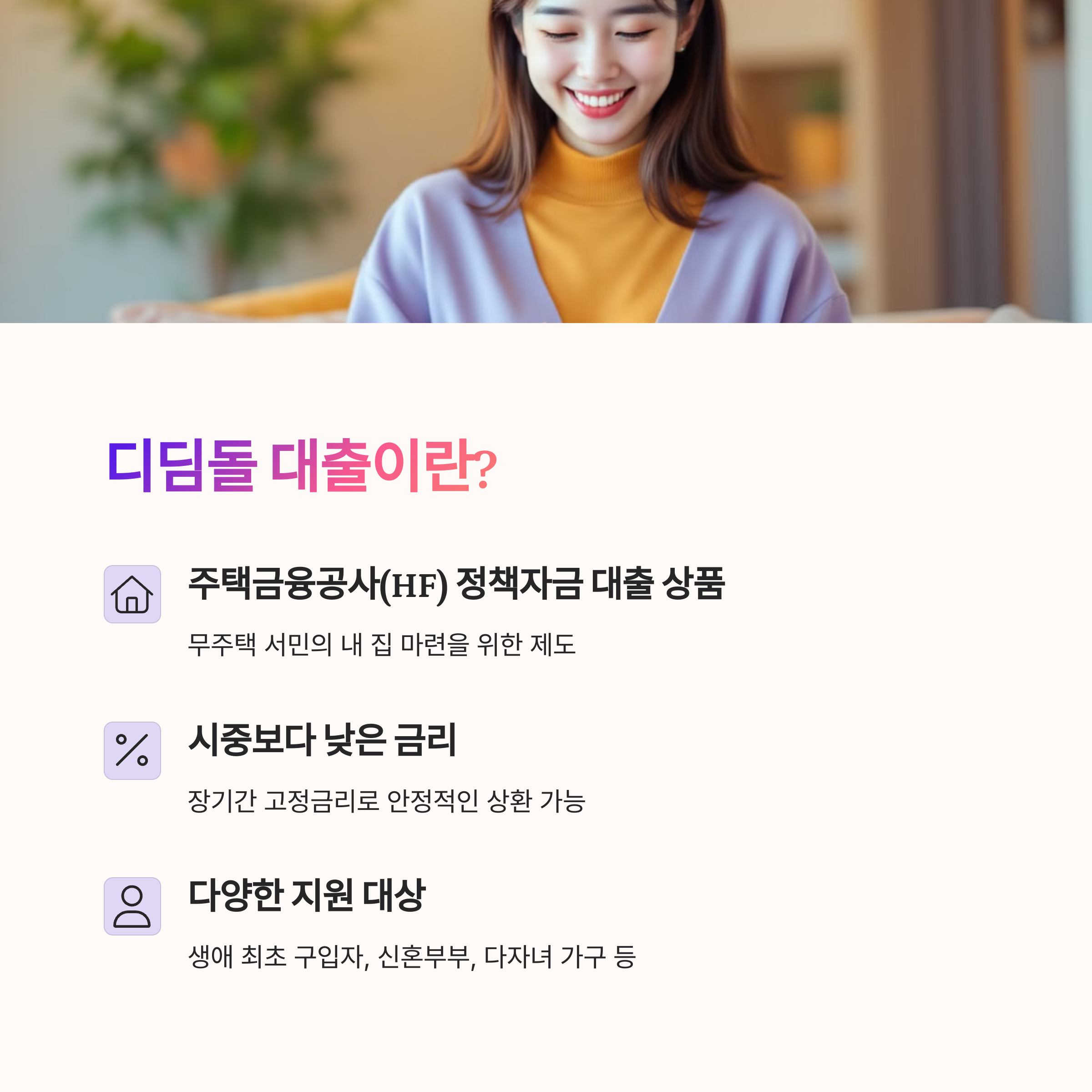 디딤돌 대출은 주택금융공사(HF)에서 운영하는 정책자금 대출 상품으로, 무주택 서민의 내 집 마련을 돕기 위해 마련된 제도입니다. 시중 대출보다 낮은 금리로 장기간 고정금리로 제공되며, 생애 최초 구입자, 신혼부부, 다자녀 가구 등 다양한 지원 대상에게 유리한 조건을 제공합니다.