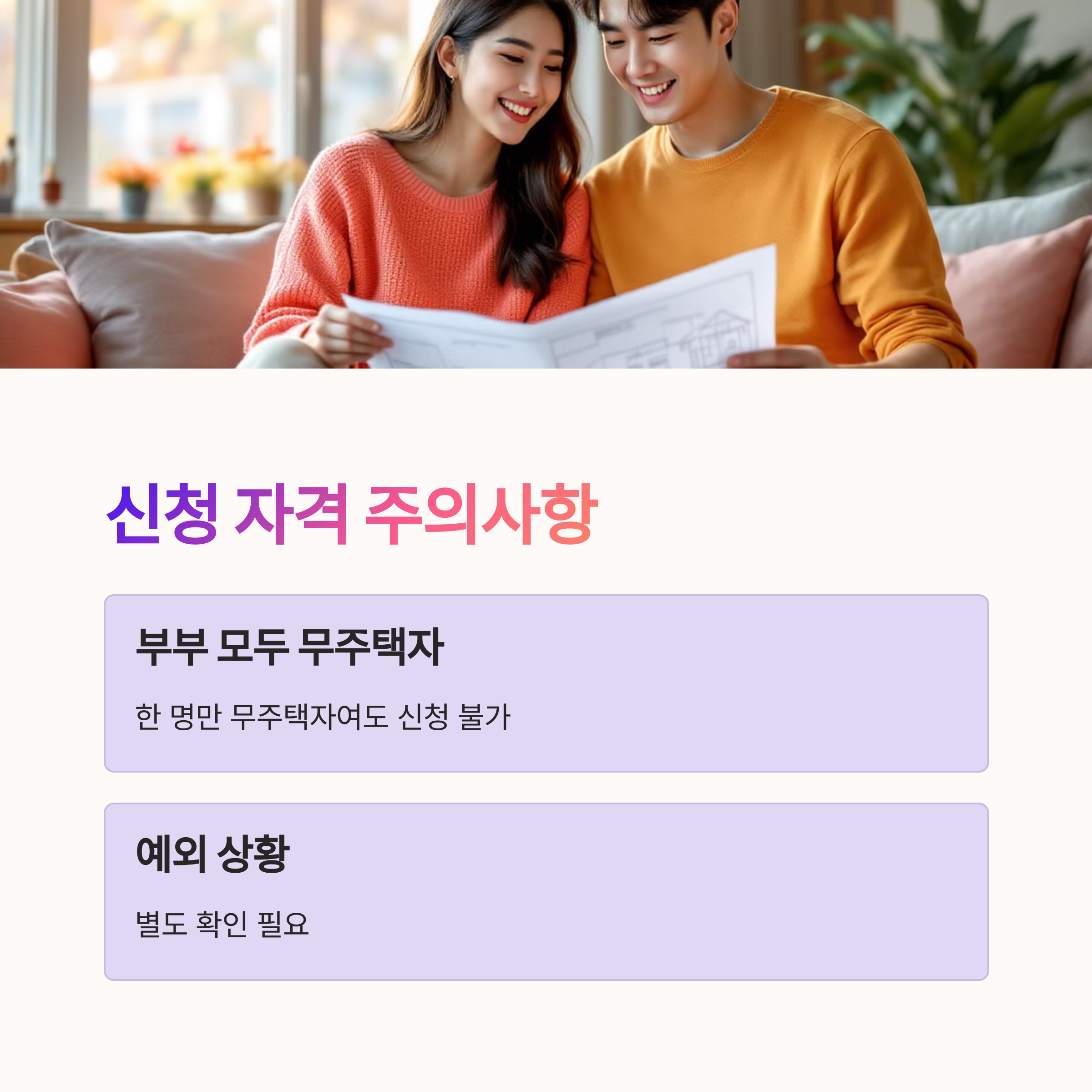 A7. 아니요. 부부 모두 무주택자여야 신청 가능합니다. 단, 예외 상황은 별도 확인 필요해요.