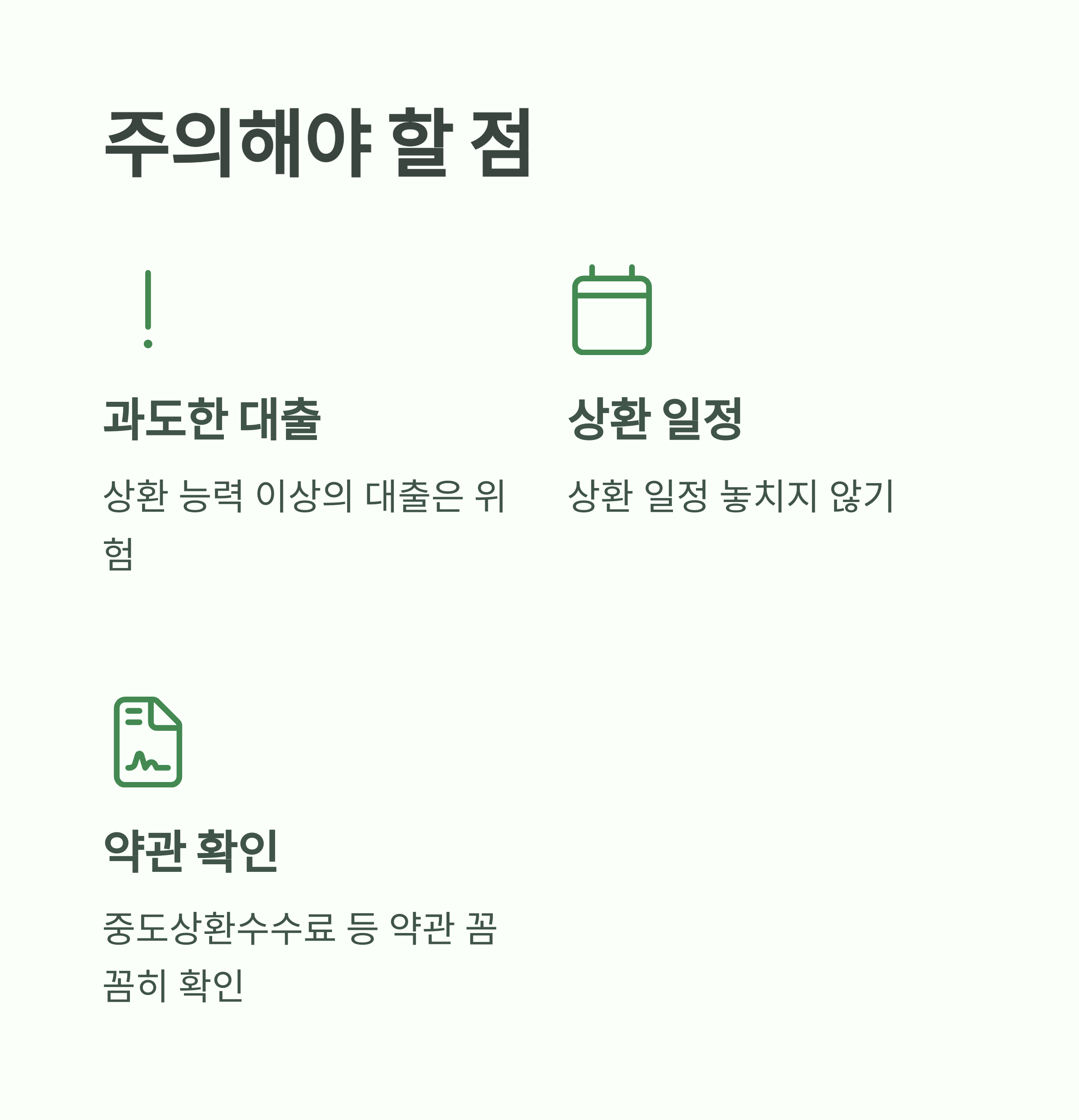 주의: 과도한 대출은 상환부담 증가 → 자신의 상환 능력 고려 필요