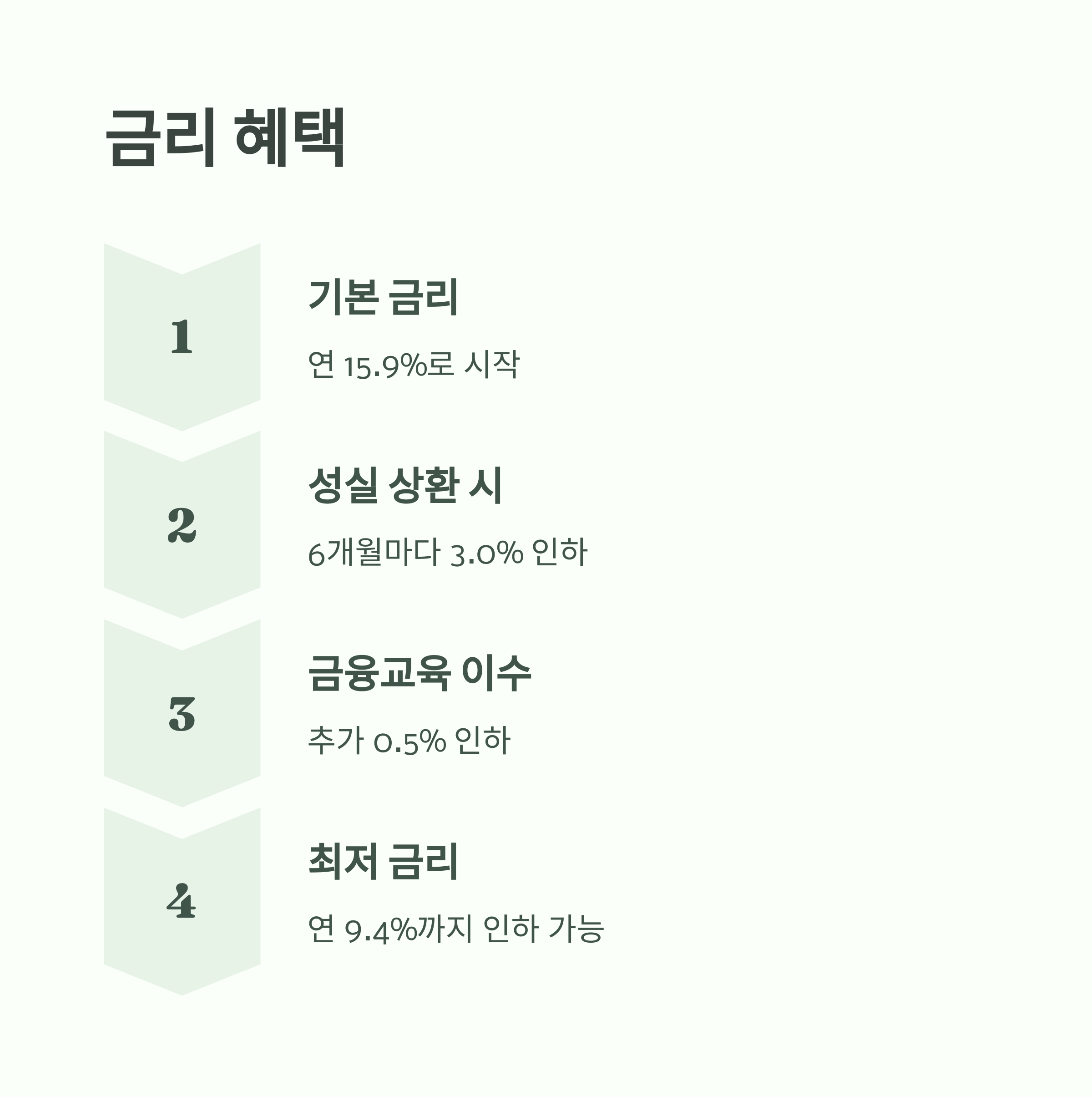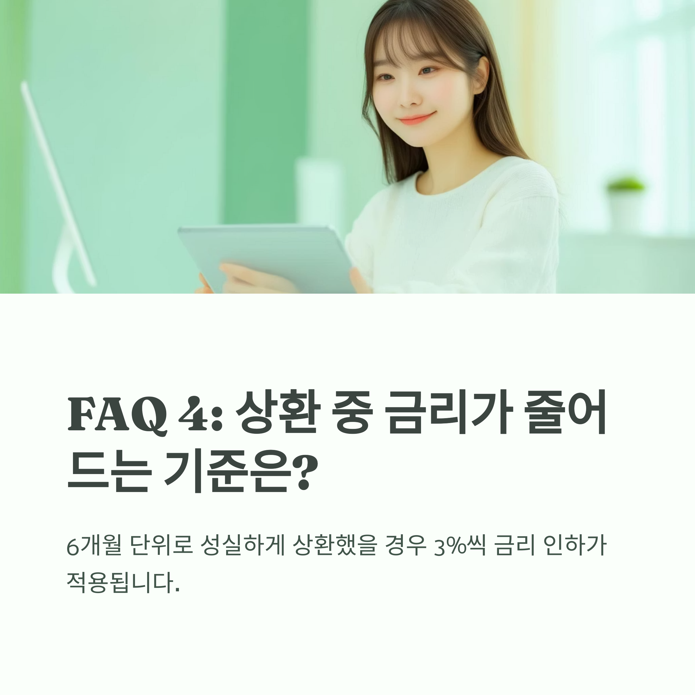 A4. 6개월 단위로 성실하게 상환했을 경우 3%씩 금리 인하가 적용됩니다.