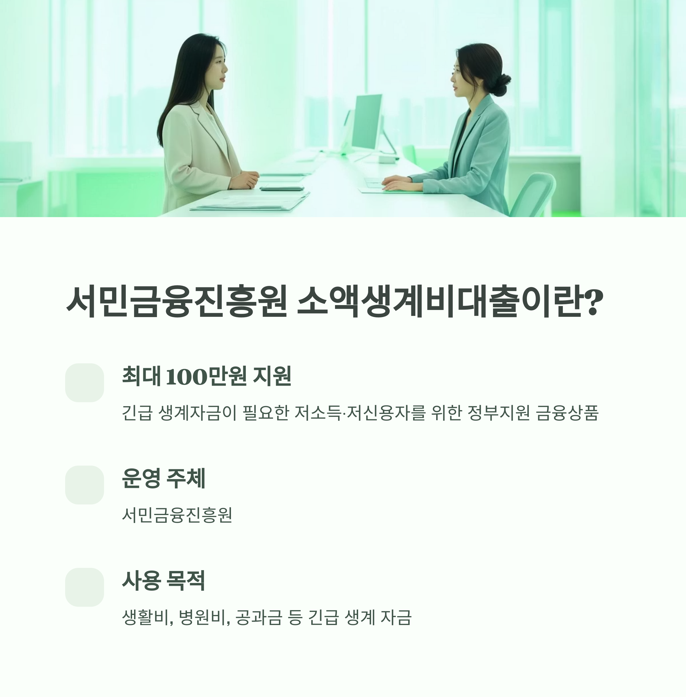 서민금융진흥원 소액생계비 대출은 최대 100만 원까지 지원받을 수 있는 정부지원 소액 금융상품입니다.