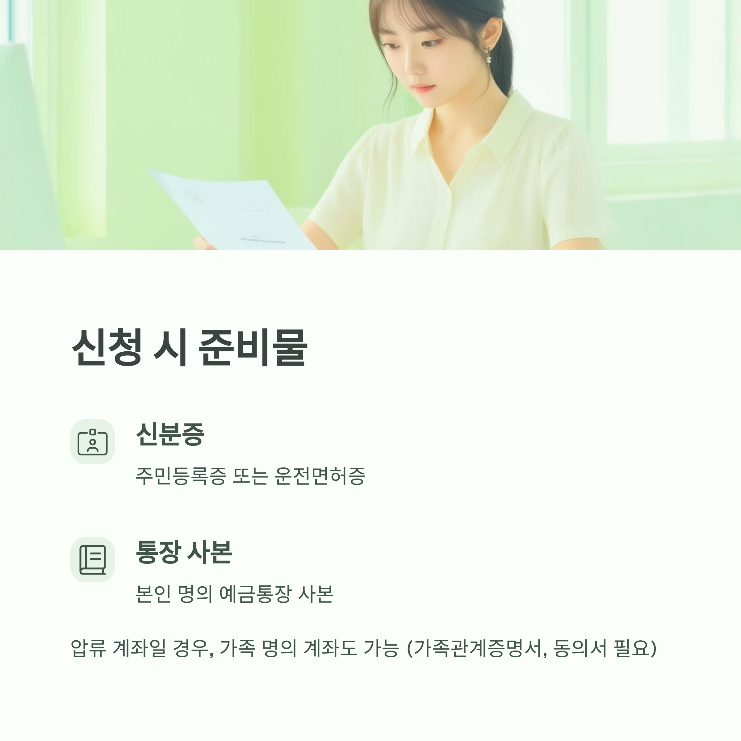 (※ 압류 계좌일 경우, 가족 명의 계좌도 가능 – 가족관계증명서, 동의서 제출 필요)