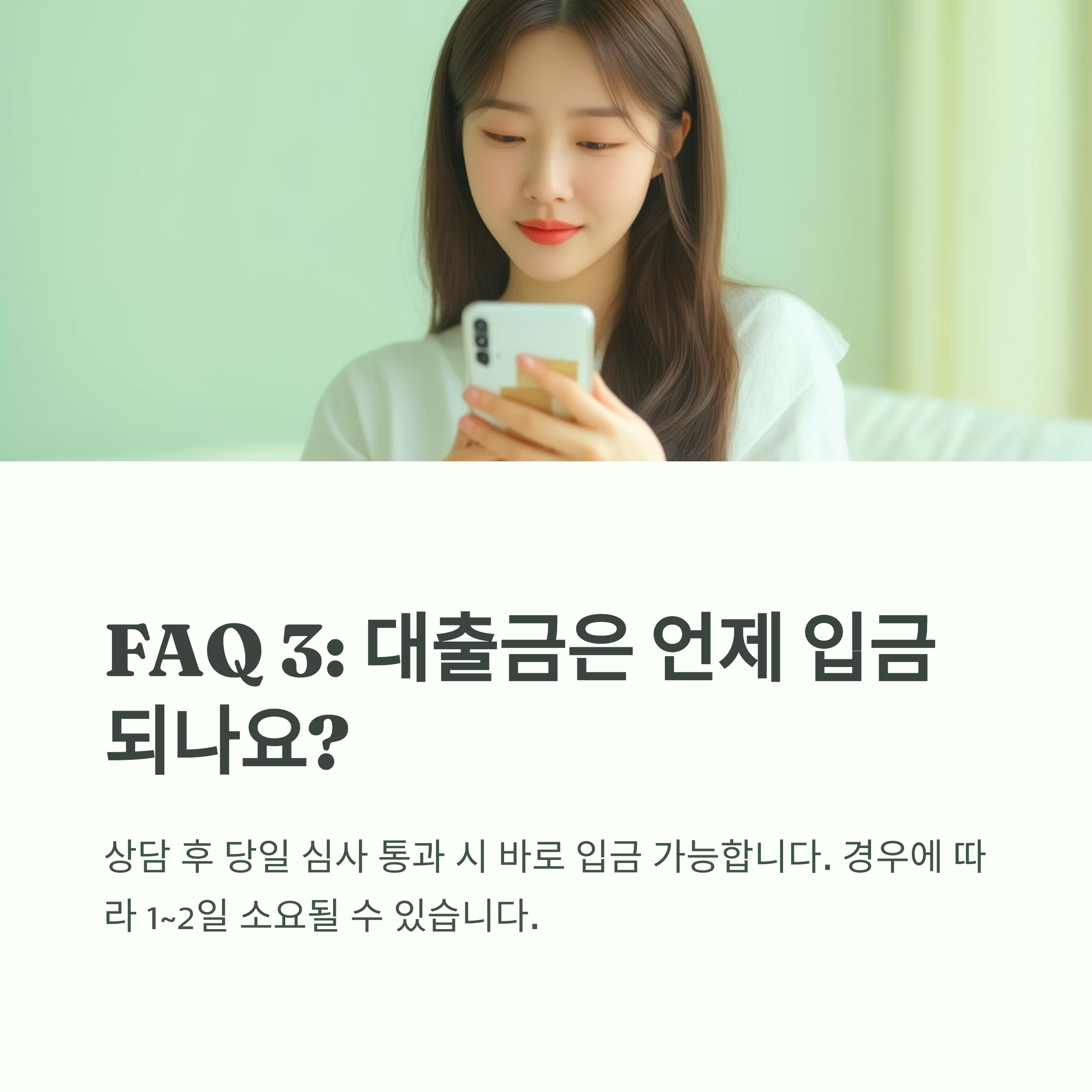 A3. 상담 후 당일 심사 통과 시 바로 입금 가능합니다. 다만, 경우에 따라 1~2일 소요될 수 있습니다.