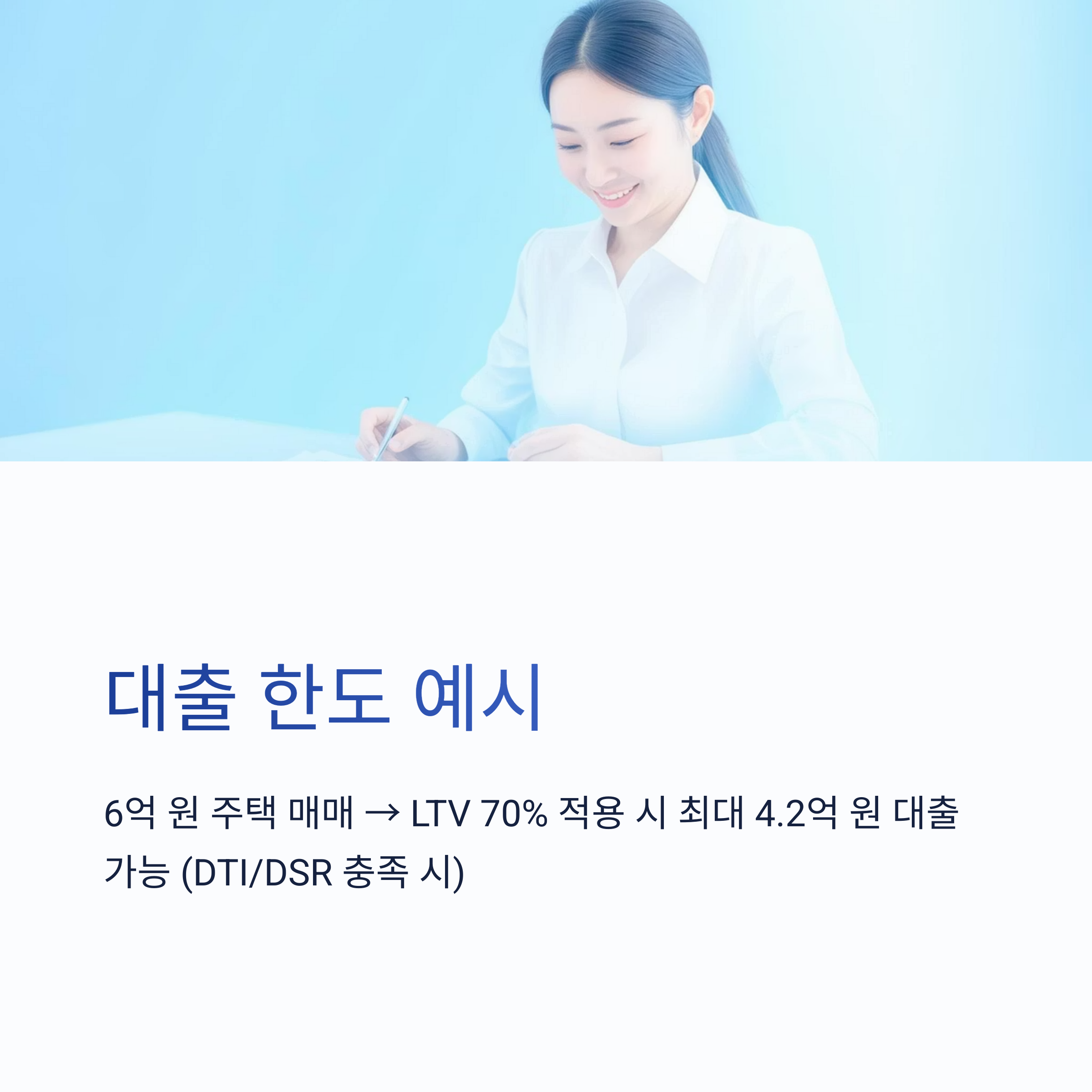 6억 원 주택 매매 → LTV 70% 적용 시 최대 4.2억 원 대출 가능 (단, DTI/DSR 충족 시)