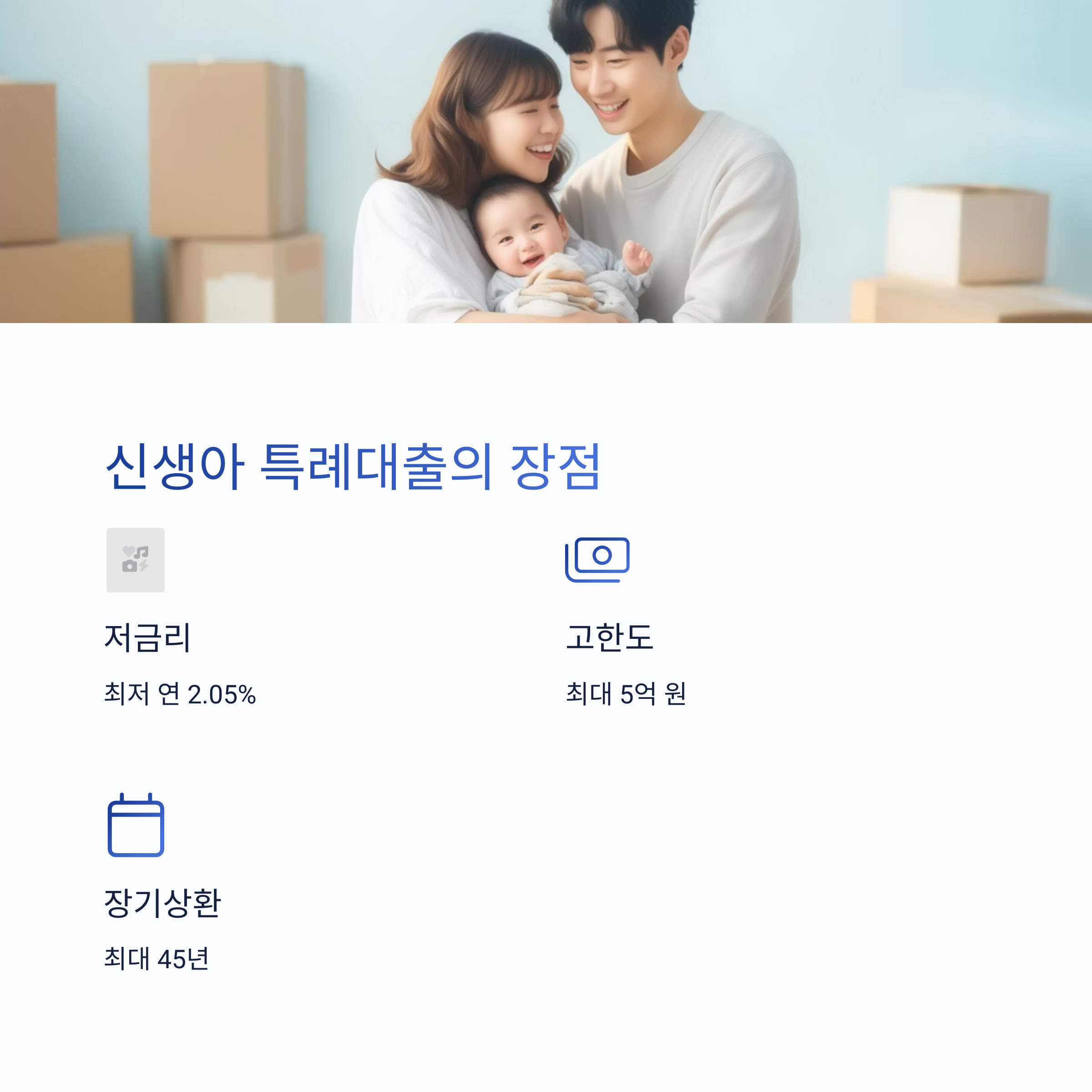 신생아 특례 대출은 출산 또는 입양 후 2년 이내 가구가 내 집 마련을 위해 주택을 구입할 때 이용할 수 있는 정부지원 정책 대출입니다. 대출 한도는 최대 5억 원, 금리는 최저 연 2.05% 수준으로, 시중 대출 상품보다 훨씬 저렴합니다.