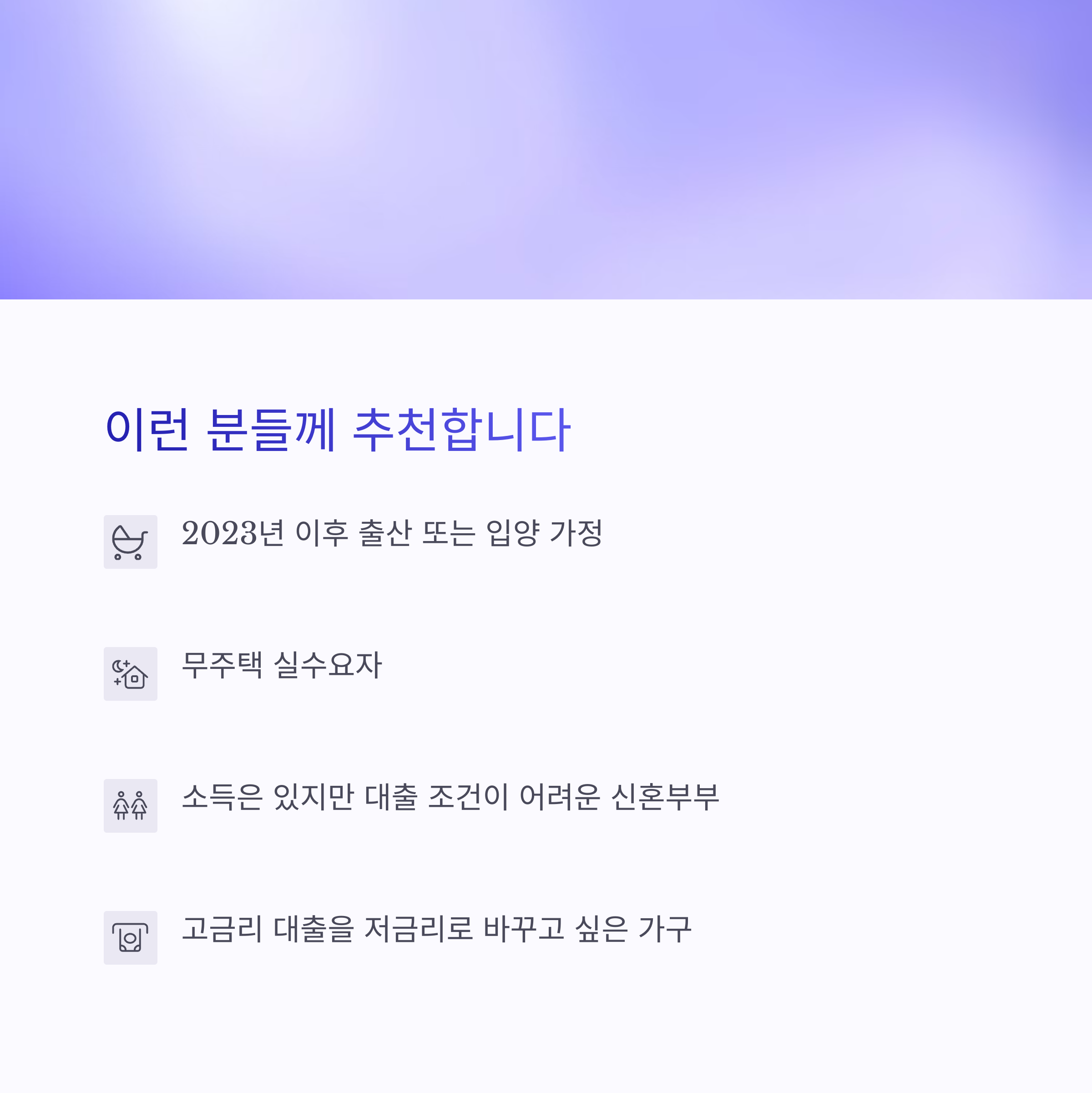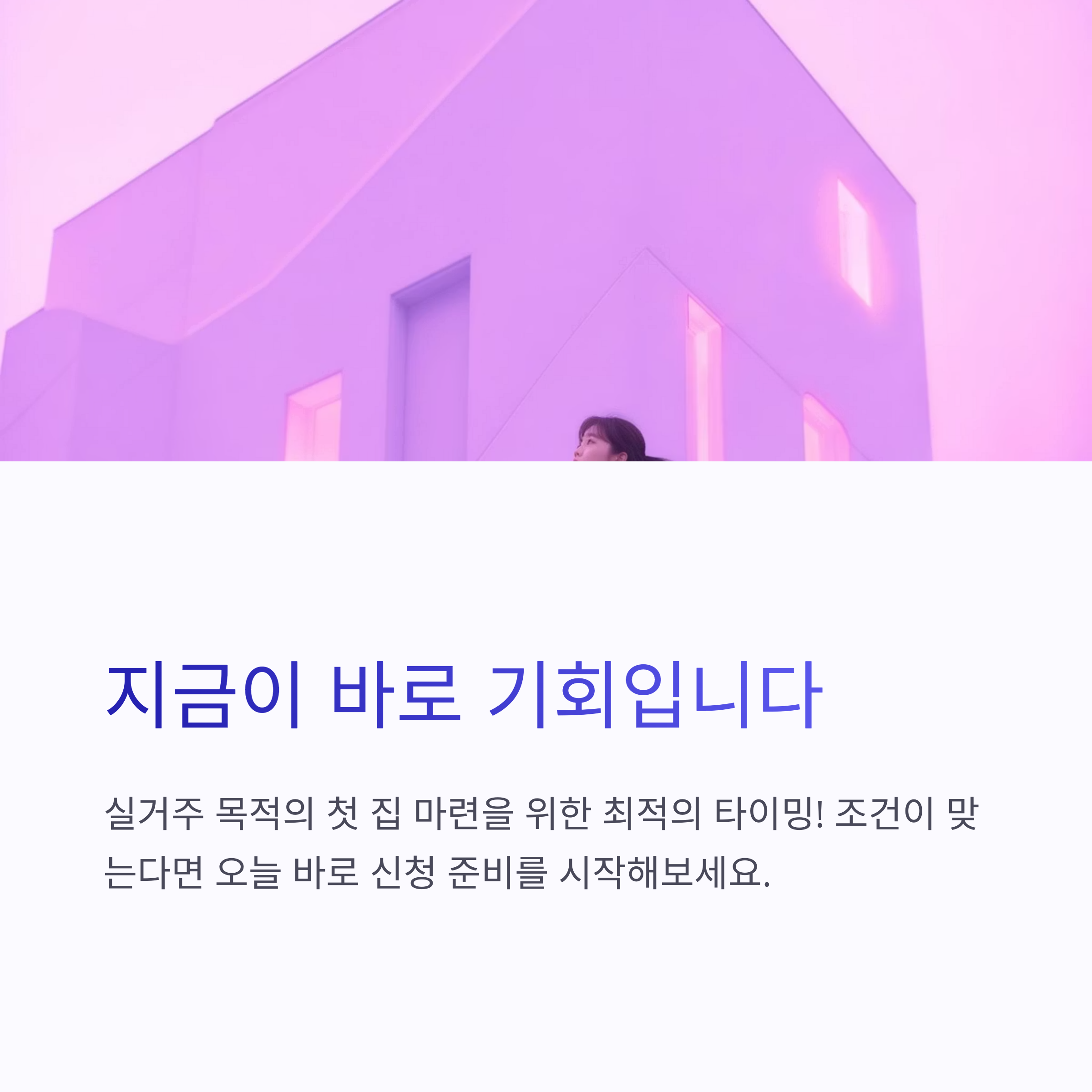 지금이 바로 실거주 목적의 첫 집 마련을 위한 최적의 타이밍! 조건이 맞는다면 오늘 바로 신청 준비를 시작해보세요.