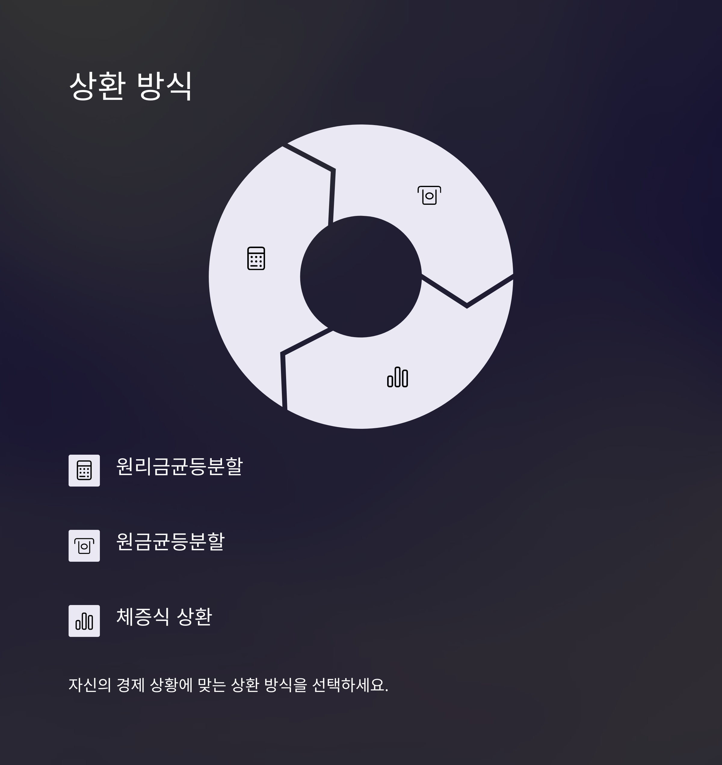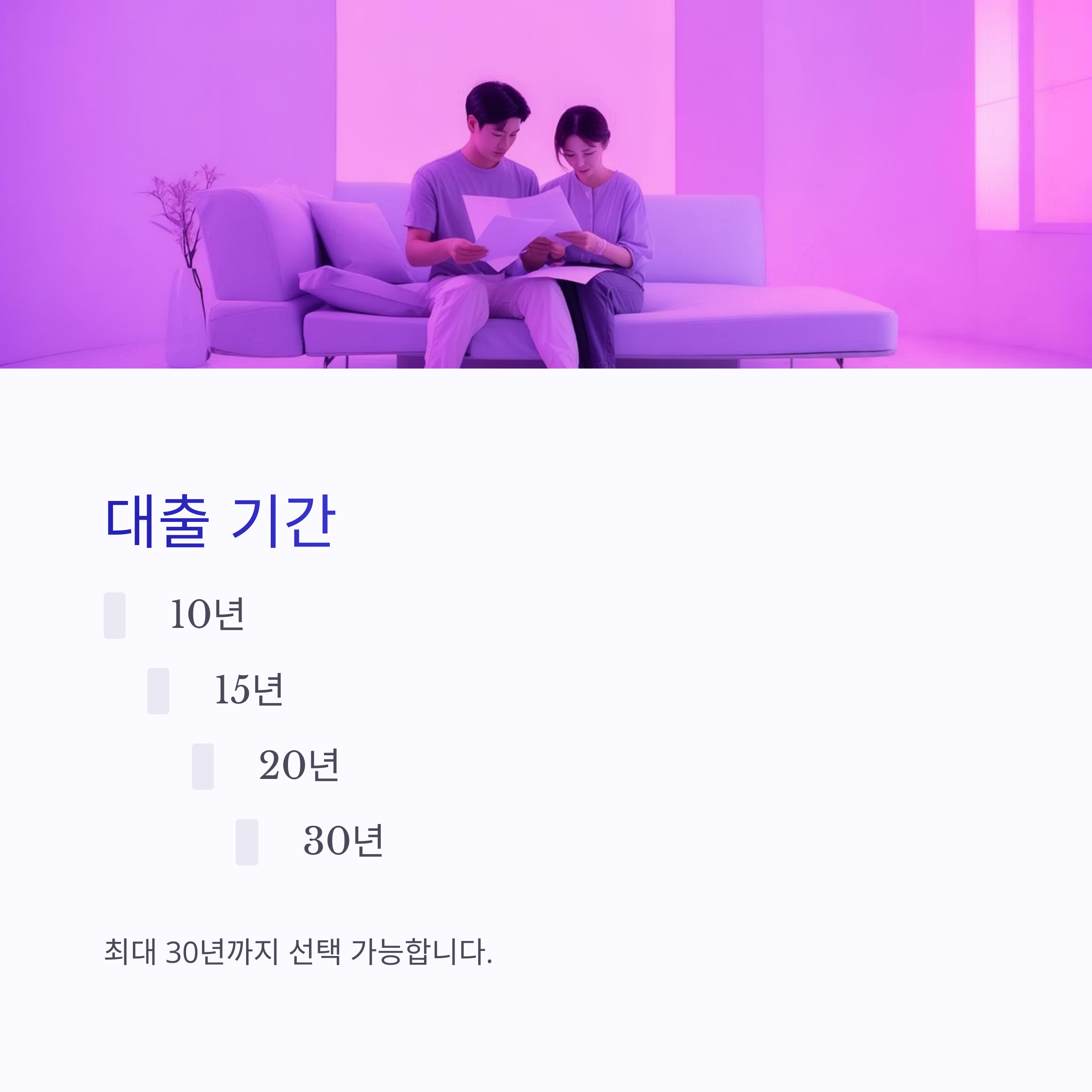 자신의 경제 상황에 맞춰 총 3가지 상환 방식과 최대 30년까지의 대출 기간을 선택할 수 있습니다.