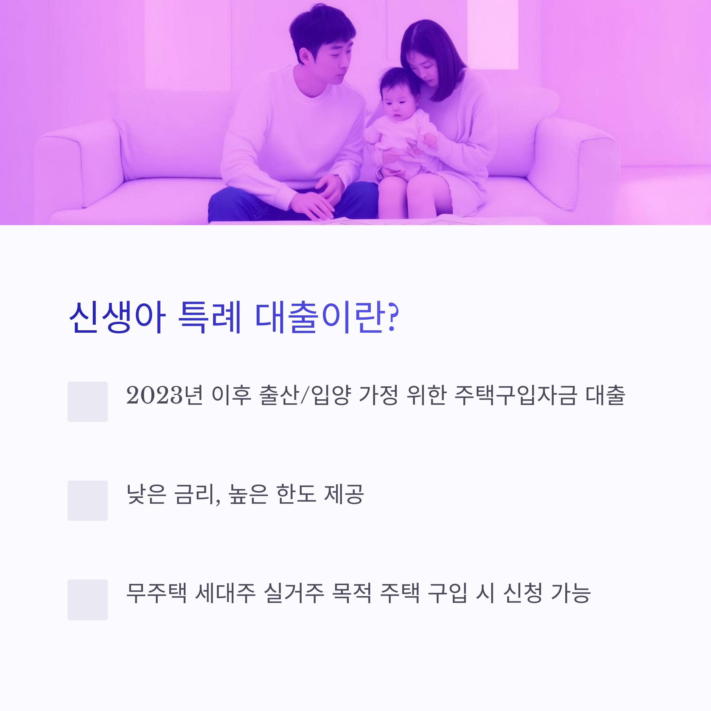 신생아 특례대출은 2023년 1월 1일 이후 출산 또는 입양한 자녀가 있는 가구를 위한 주택구입자금 대출입니다. 기존 디딤돌대출과 비교해 더 낮은 금리, 더 높은 한도를 자랑합니다.