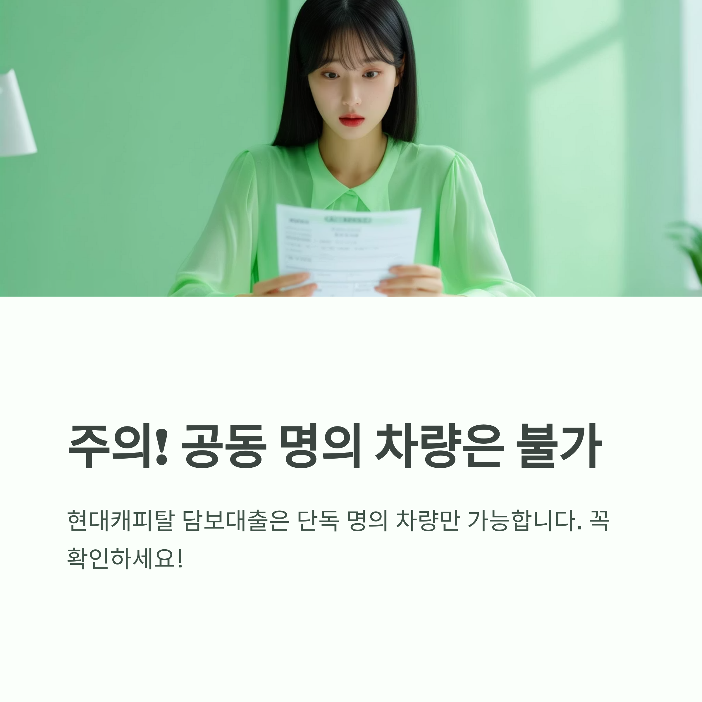 단, 공동 명의 차량은 불가하므로 단독 명의를 꼭 확인해야 합니다.