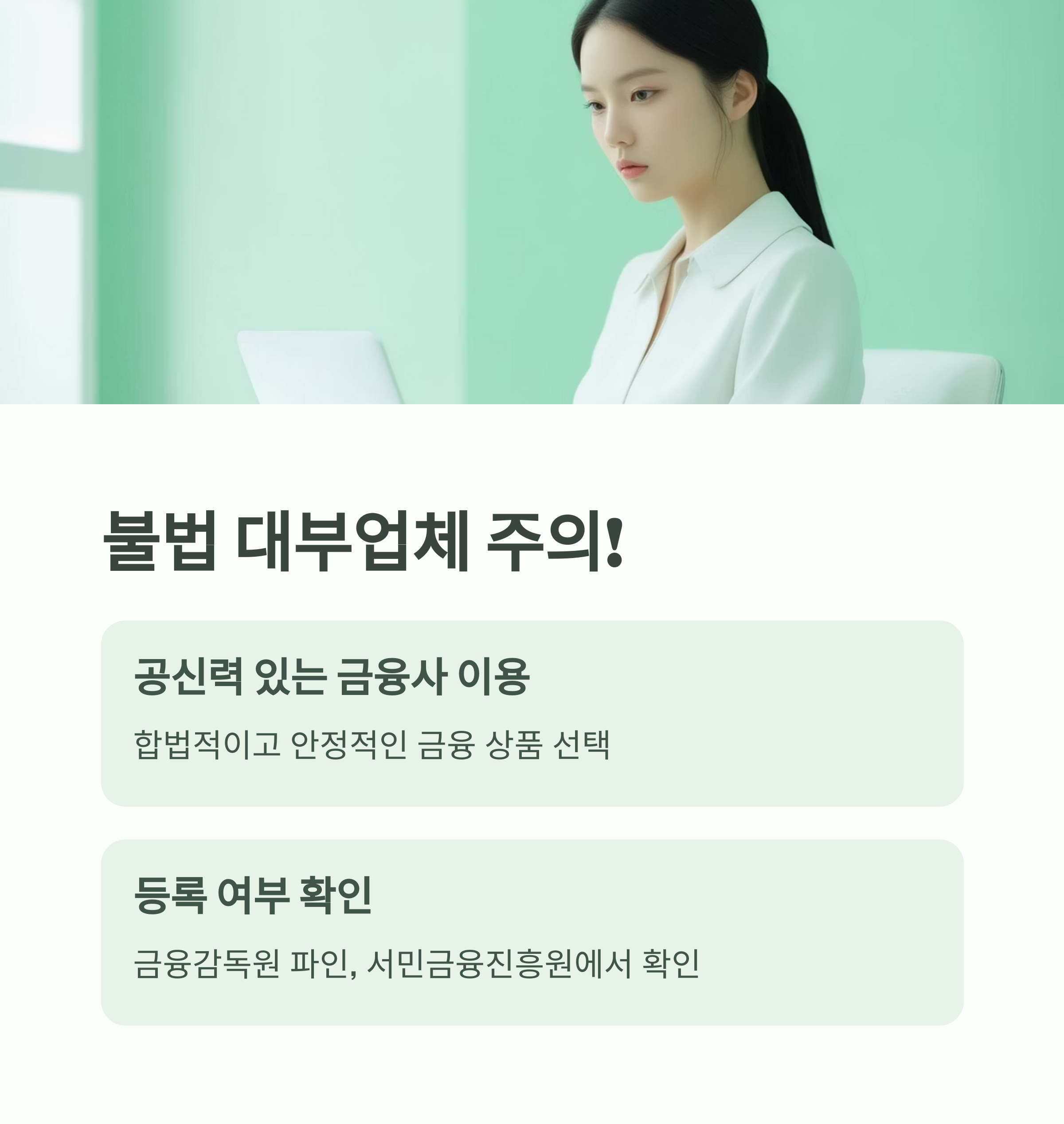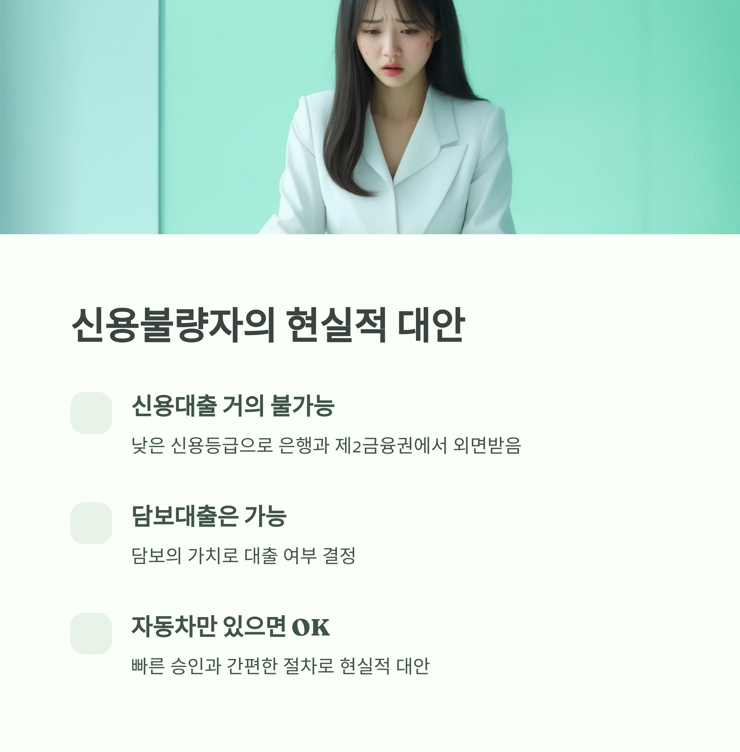 신용불량자일수록 불법 대부업이나 고금리 상품에 노출되기 쉽습니다. 이럴 때 공신력 있는 금융사의 자동차담보대출을 통해 합법적이고 안정적인 금융 상품을 이용하는 것이 매우 중요합니다. 금융감독원 파인, 서민금융진흥원에서 등록 여부를 반드시 확인하세요.