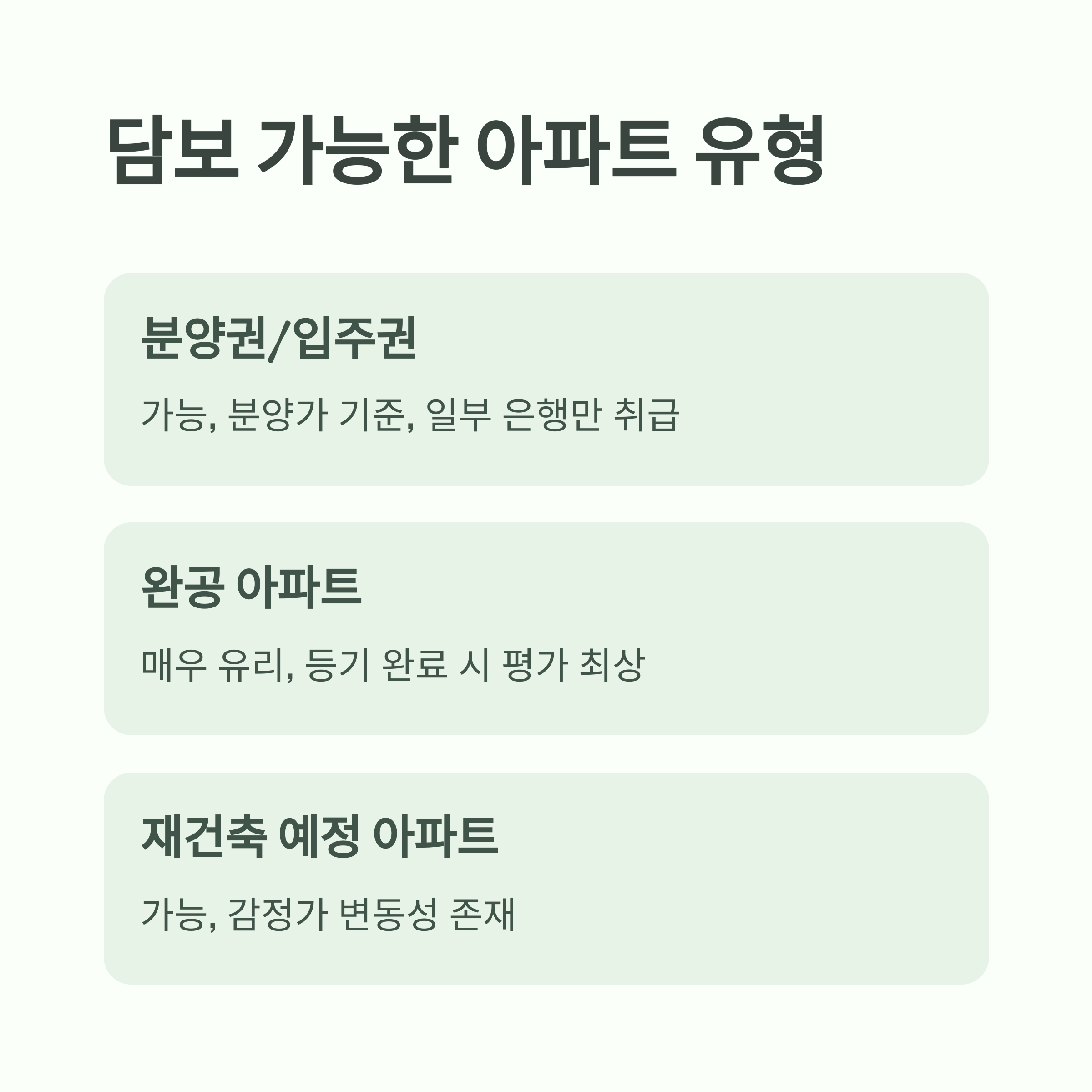 | 완공 아파트 | 매우 유리 | 등기 완료 시 평가 최상 |