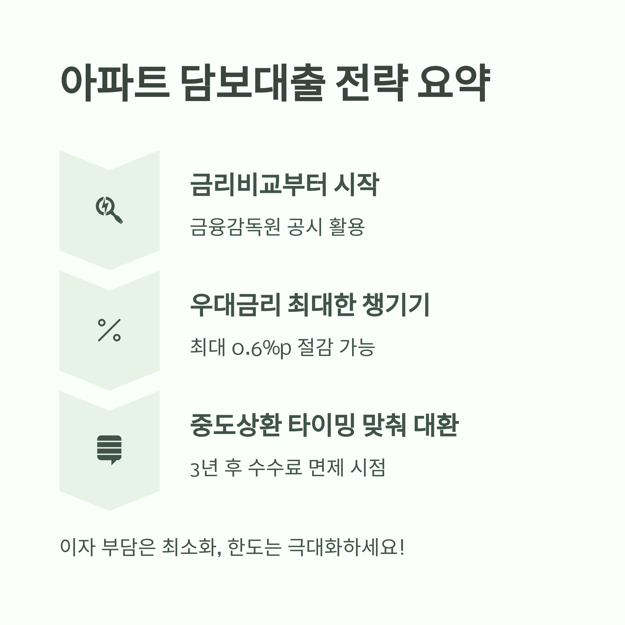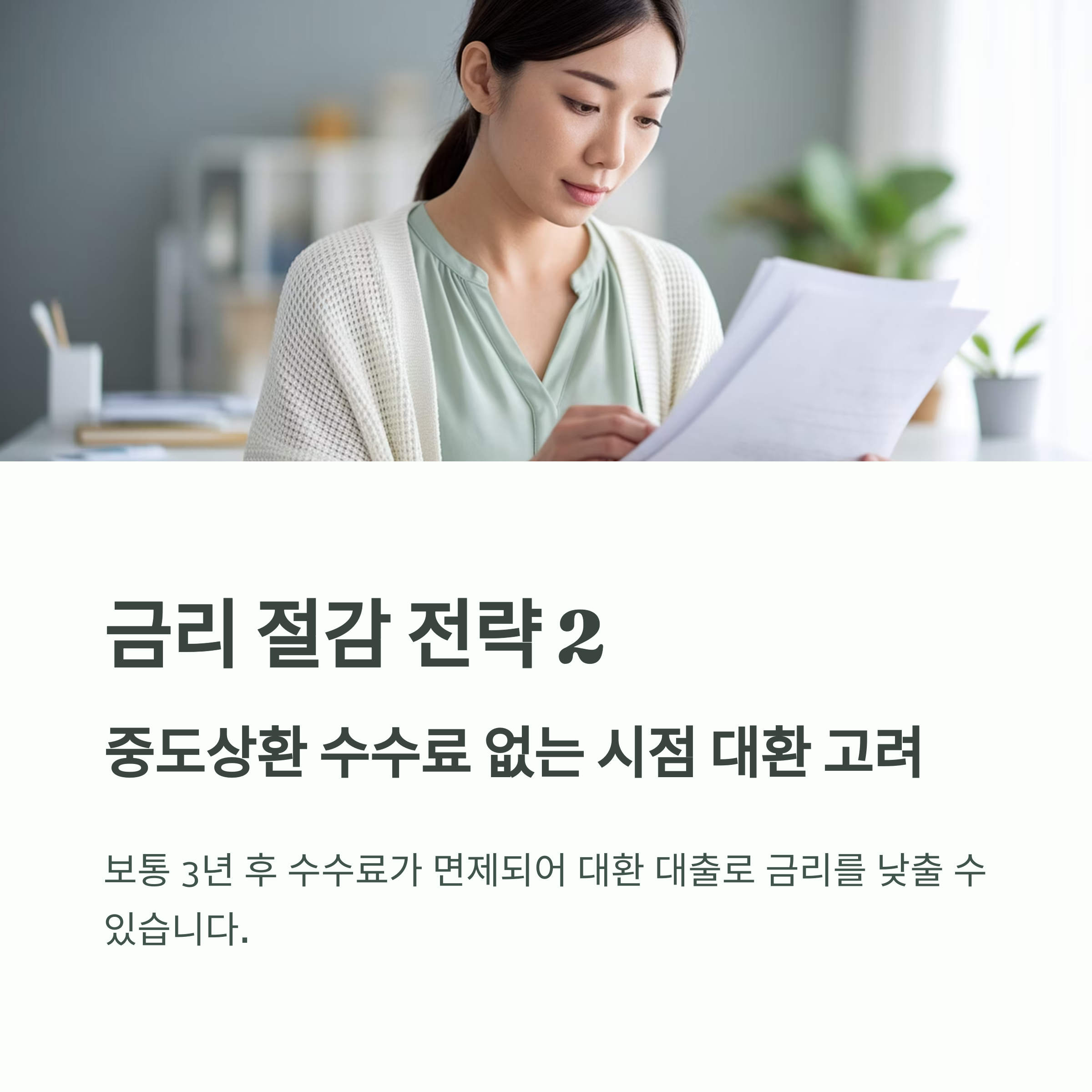 - 중도상환 수수료 없는 시점 대환 고려: 보통 3년 후 수수료 면제