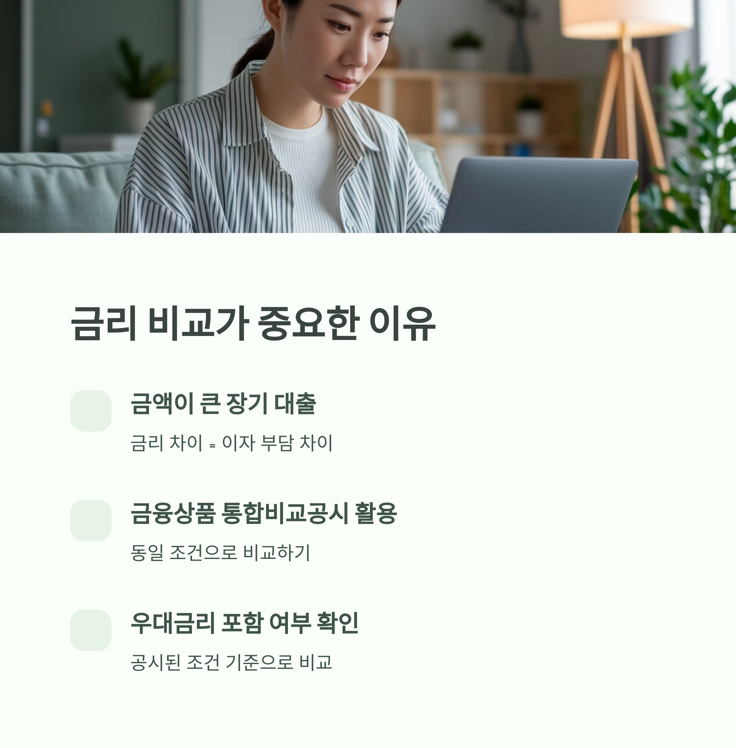 - 동일 조건으로 비교 (LTV, 만기, 신용점수 기준 맞추기)