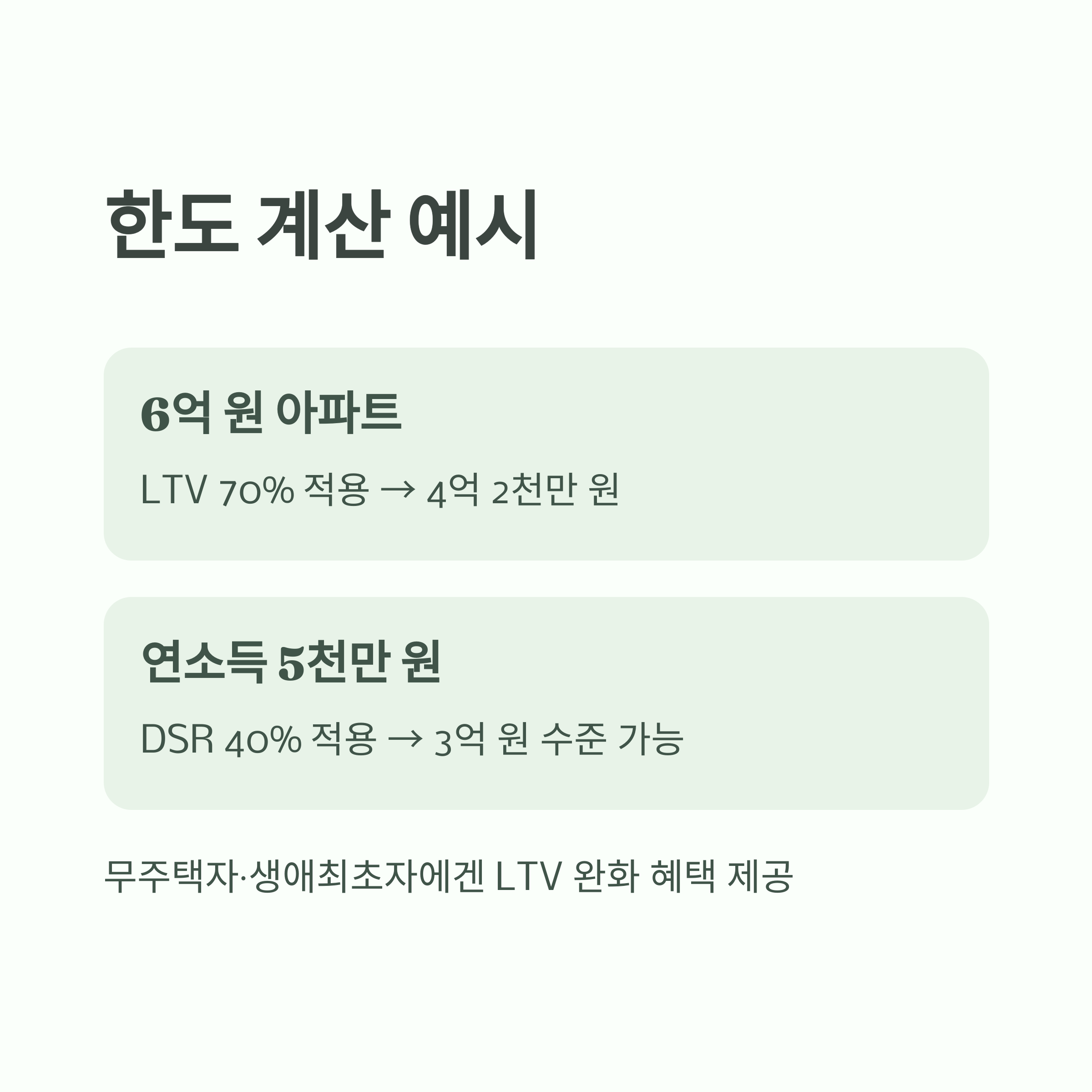 - LTV(담보인정비율): 수도권 최대 70%, 비수도권 최대 60%