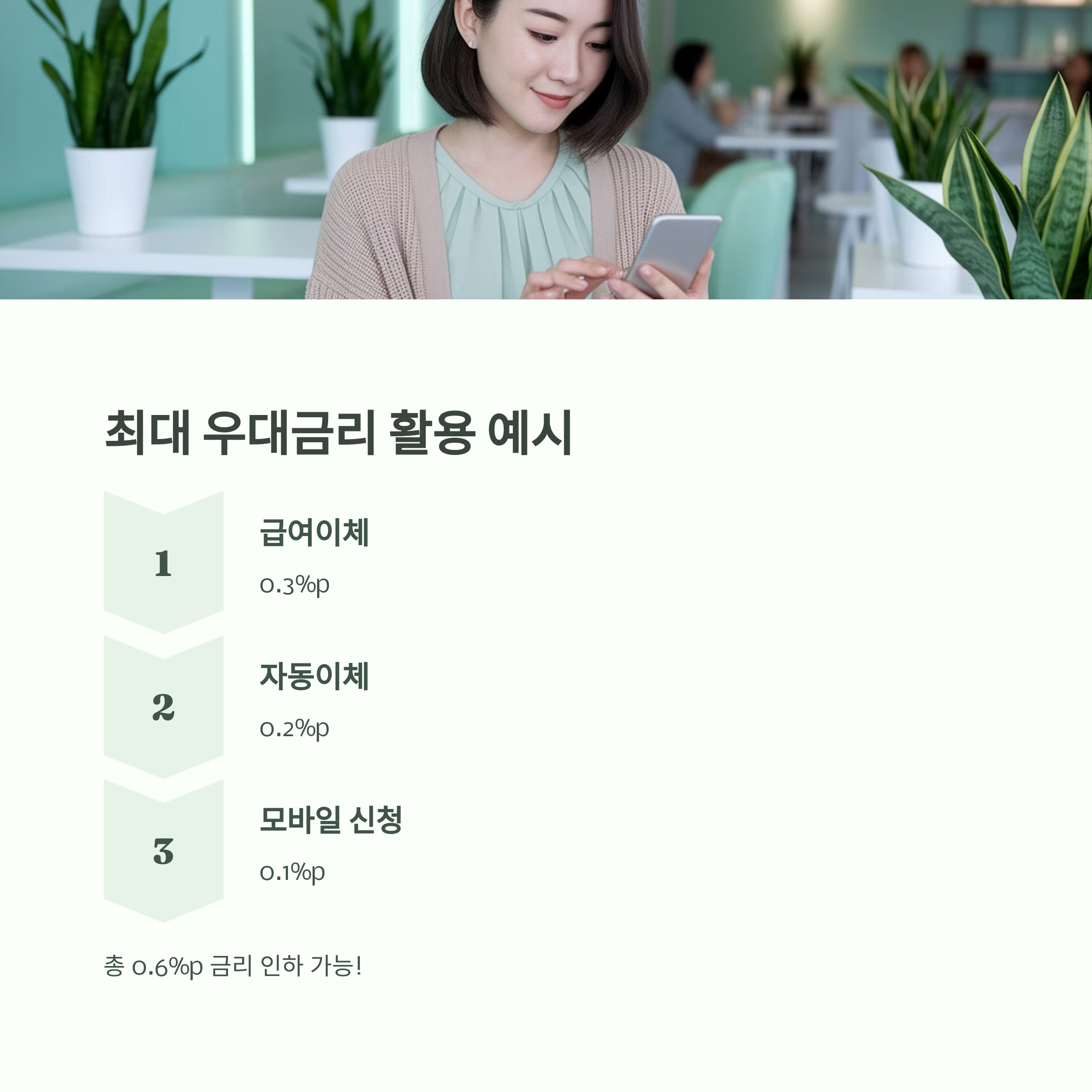 예시: 급여이체 + 자동이체 + 모바일 신청 = 최대 0.6%p 우대 가능
