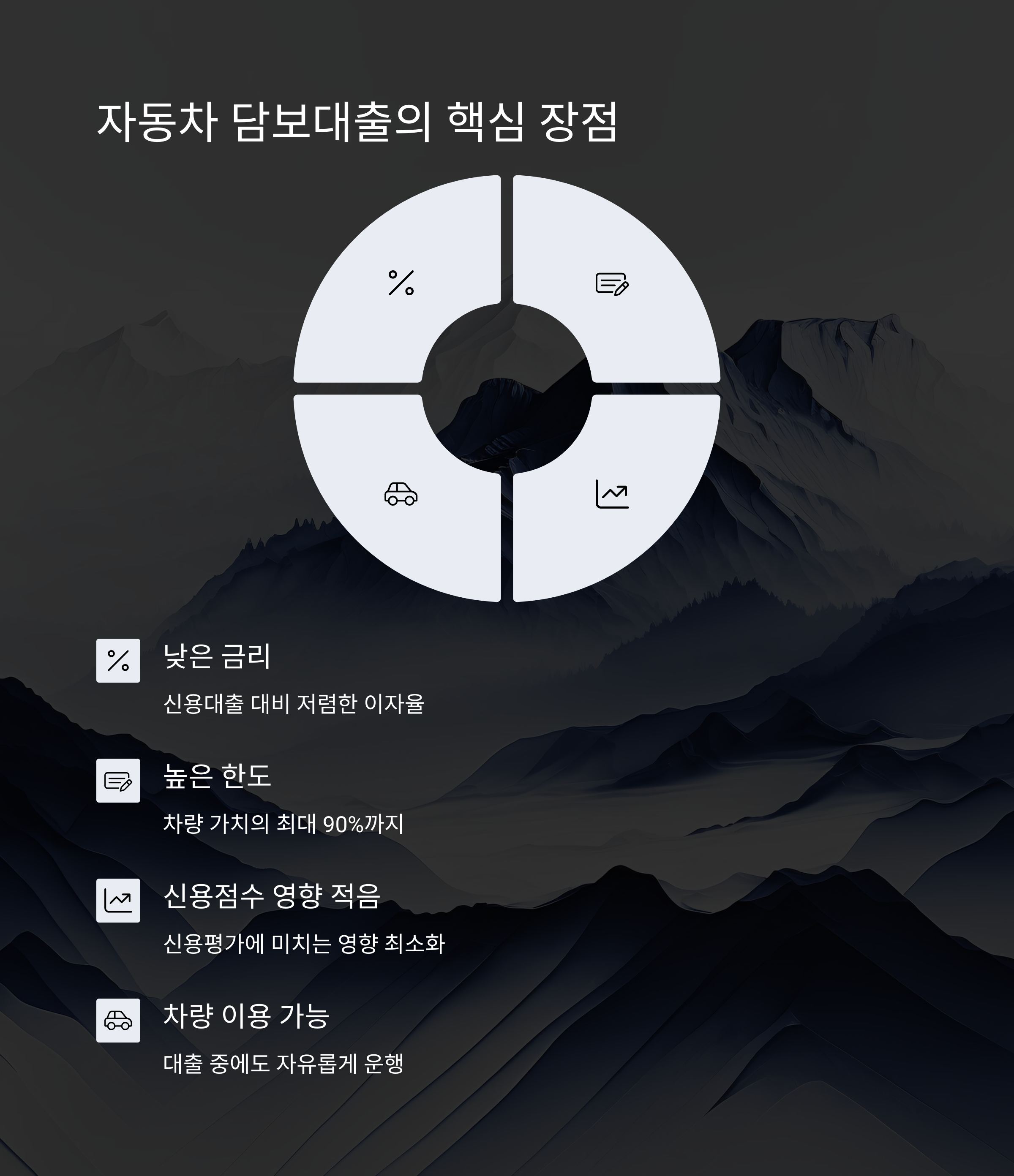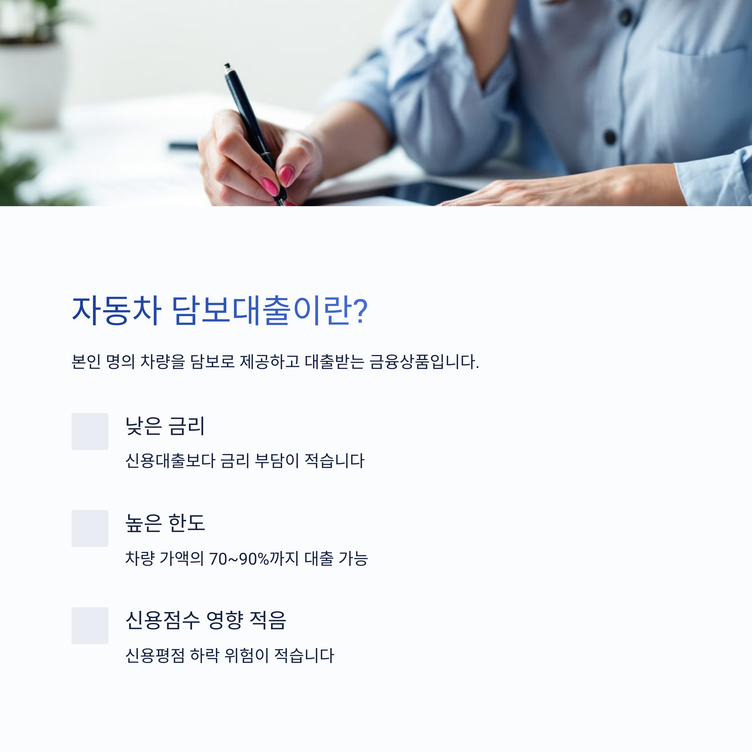 자동차 담보대출은 본인 명의의 차량을 담보로 제공하고 대출을 받는 금융상품입니다. 신용대출과 달리 차량을 담보로 하기 때문에 금리가 낮고 대출 한도가 높아지는 장점이 있습니다. 또한, 신용점수 영향이 적고, 차량을 계속 이용하면서 대출을 받을 수 있다는 점에서 많은 사람들이 선호하는 방식입니다.