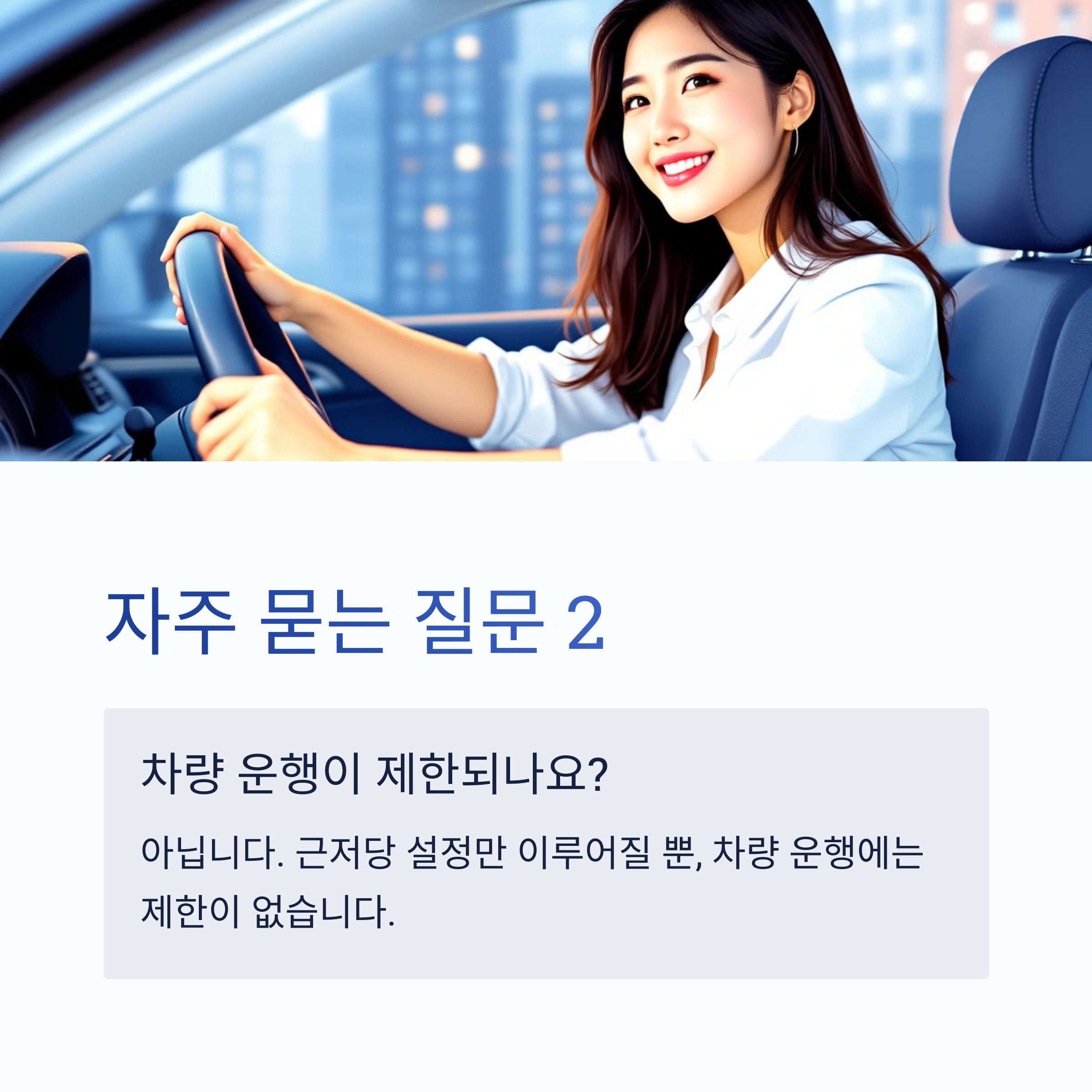 A2. 아닙니다. 근저당 설정만 이루어질 뿐, 차량 운행에는 제한이 없습니다.