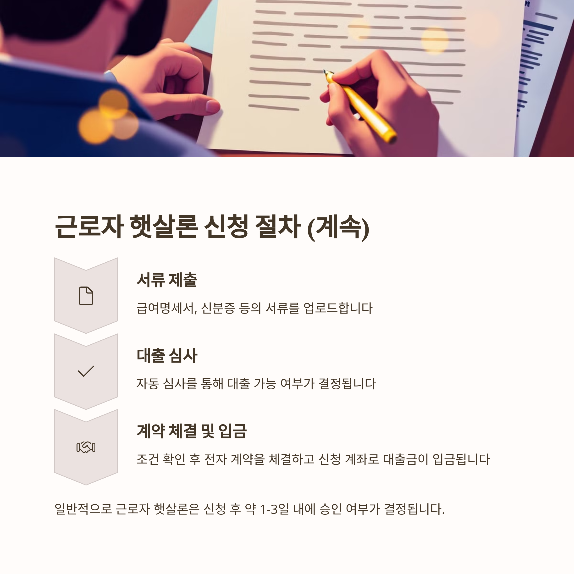 - 대출금 지급: 계약 완료 후 신청 계좌로 입금