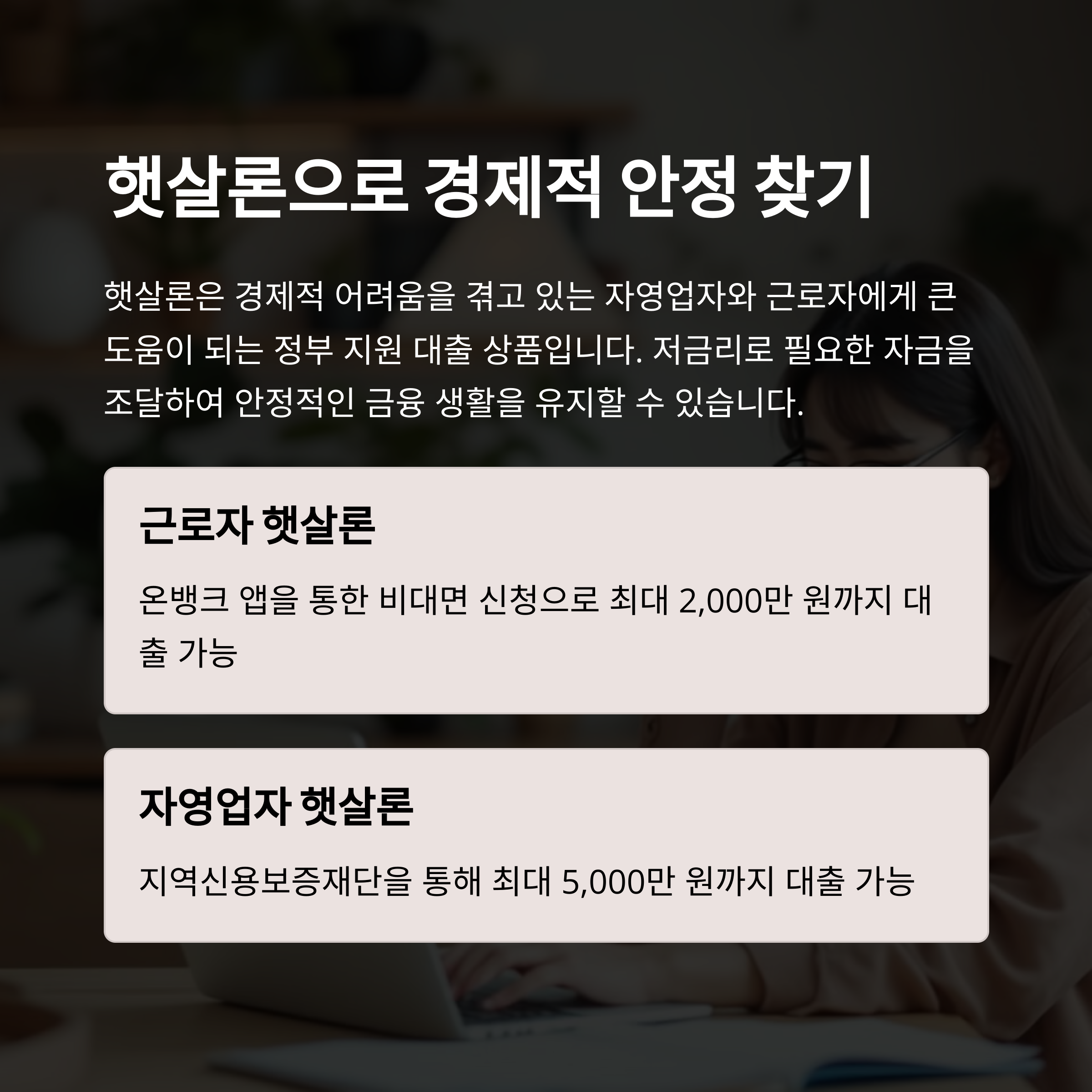 자영업자와 근로자를 위한 햇살론은 정부 지원으로 저금리 대출을 제공하는 유용한 금융 상품입니다. 비대면으로 쉽게 신청할 수 있는 근로자 햇살론과 신용보증재단을 통한 자영업자 햇살론을 적극 활용하여 보다 안정적인 금융 생활을 유지하세요!