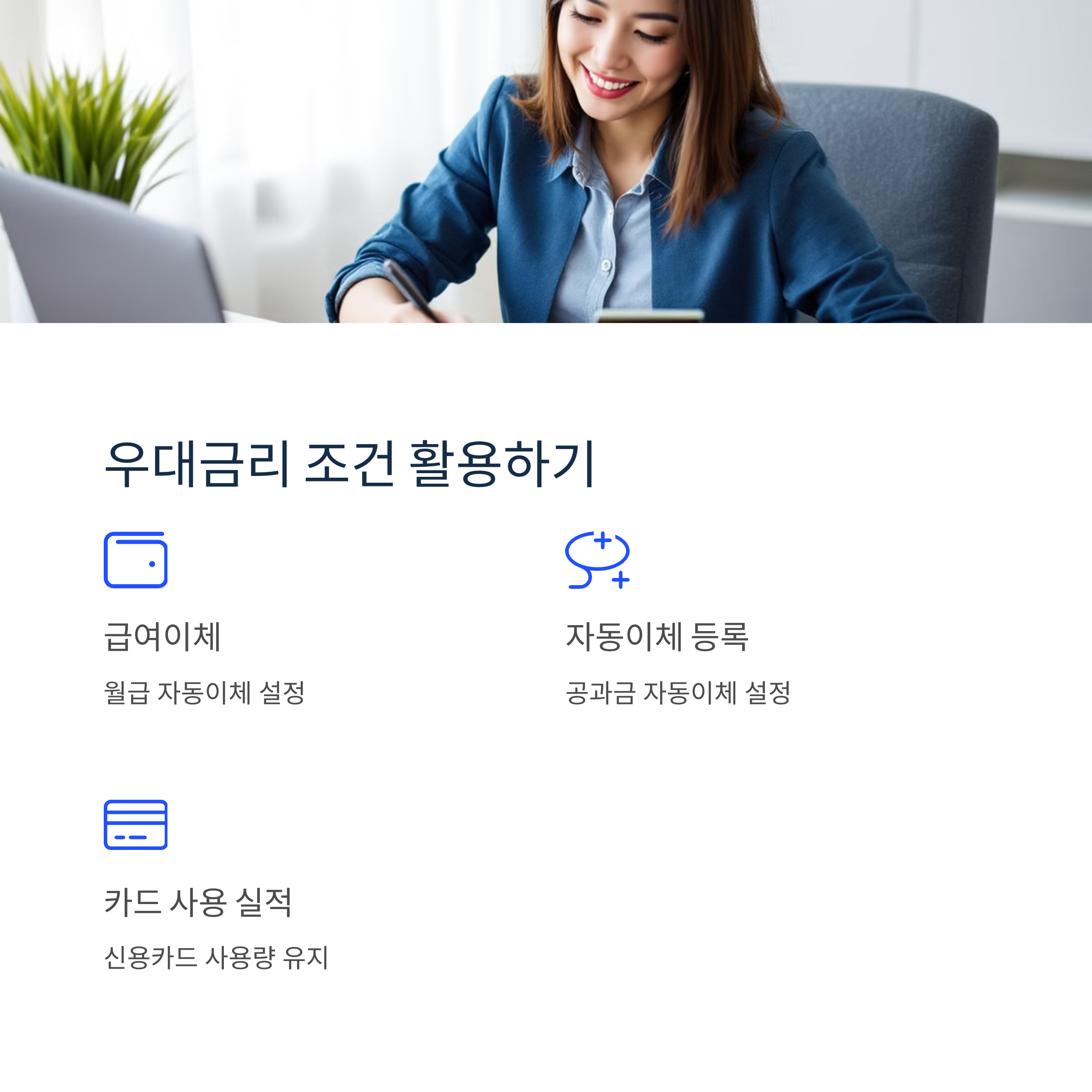 급여이체, 자동이체 등록, 신용카드 사용 실적 등을 활용하면 추가 우대금리를 받을 수 있습니다.