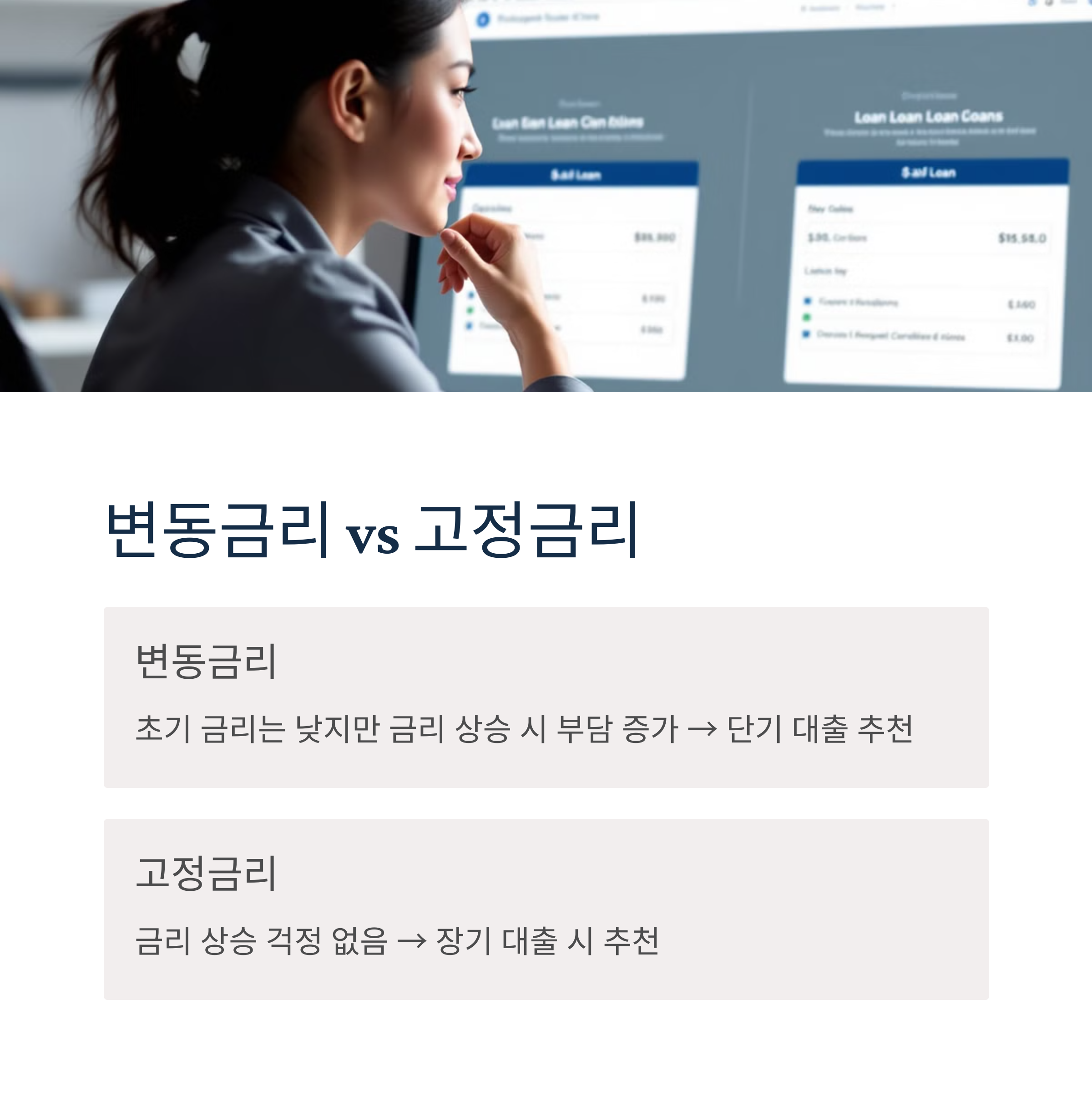 - 변동금리: 초기 금리는 낮지만 금리 상승 시 부담 증가 → 단기 대출 추천
