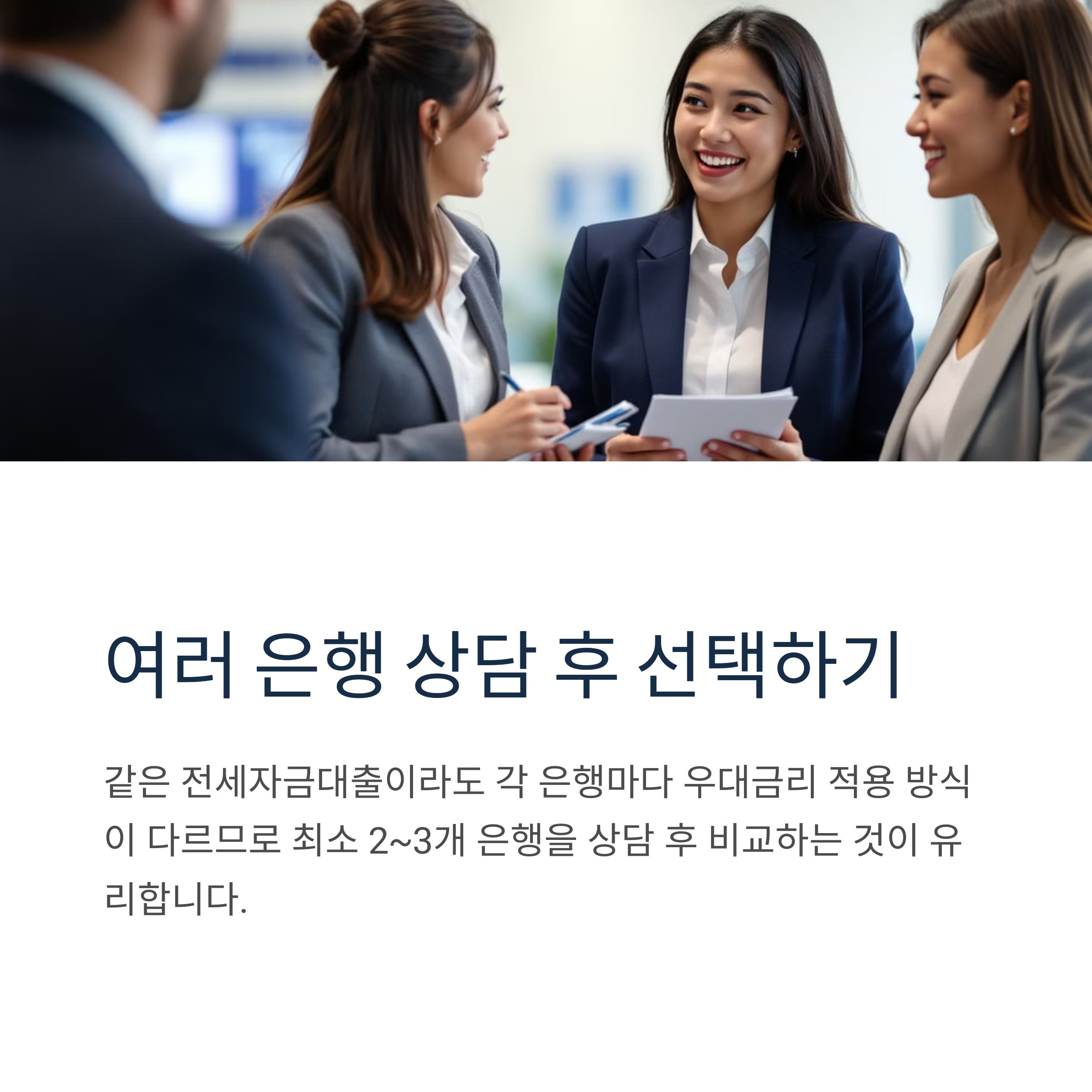 같은 전세자금대출이라도 각 은행마다 우대금리 적용 방식이 다르므로 최소 2~3개 은행을 상담 후 비교하는 것이 유리합니다.