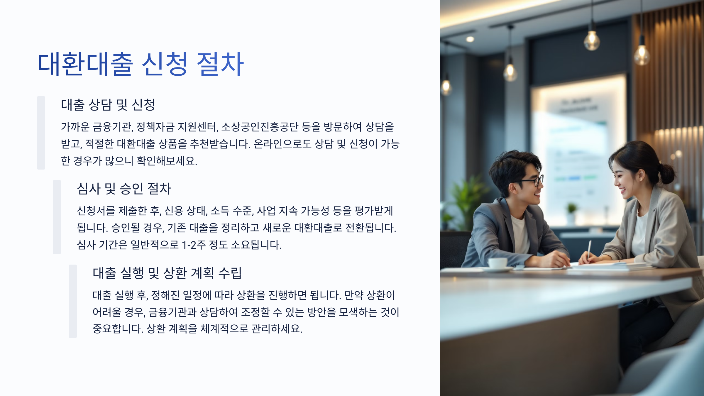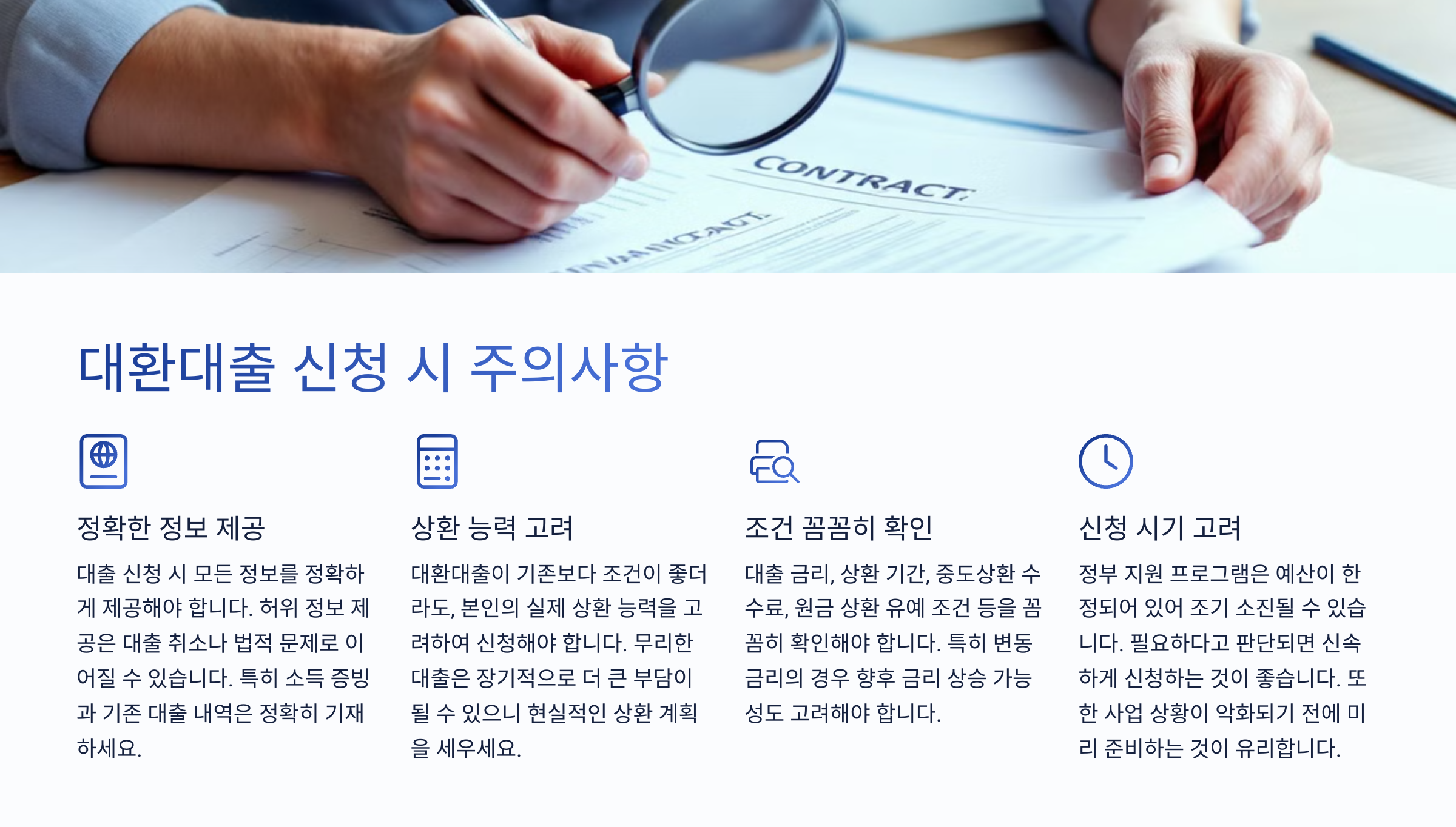 신청서를 제출한 후, 신용 상태, 소득 수준, 사업 지속 가능성 등을 평가받게 됩니다. 승인될 경우, 기존 대출을 정리하고 새로운 대환대출로 전환됩니다.
