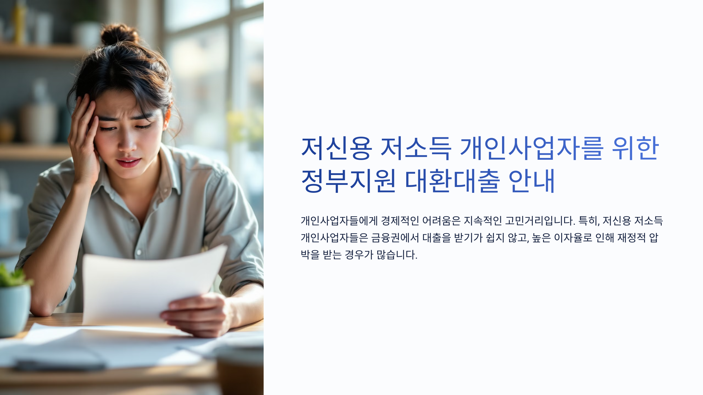 대출을 받아 사업을 운영하는 개인사업자들은 경기 변동과 매출 감소로 인해 경제적 어려움을 겪는 경우가 많습니다. 특히, 저신용 저소득 사업자는 신용도가 낮다는 이유로 일반 금융기관에서 대출을 받기 어렵고, 설령 대출을 받더라도 고금리 대출에 의존할 수밖에 없는 현실입니다.