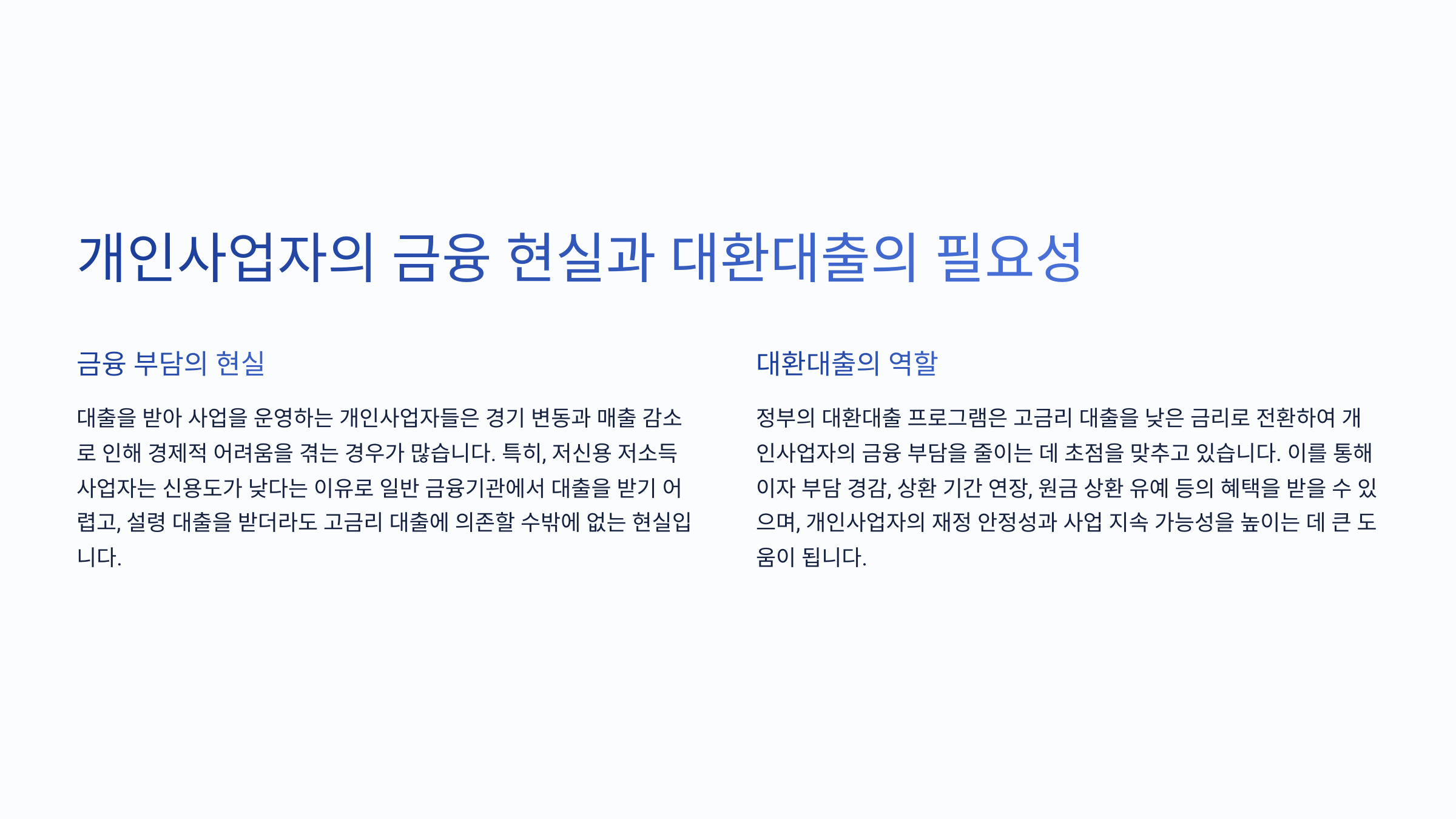 정부의 대환대출 프로그램은 고금리 대출을 낮은 금리로 전환하여 개인사업자의 금융 부담을 줄이는 데 초점을 맞추고 있습니다. 이를 통해 이자 부담 경감, 상환 기간 연장, 원금 상환 유예 등의 혜택을 받을 수 있으며, 개인사업자의 재정 안정성과 사업 지속 가능성을 높이는 데 큰 도움이 됩니다.