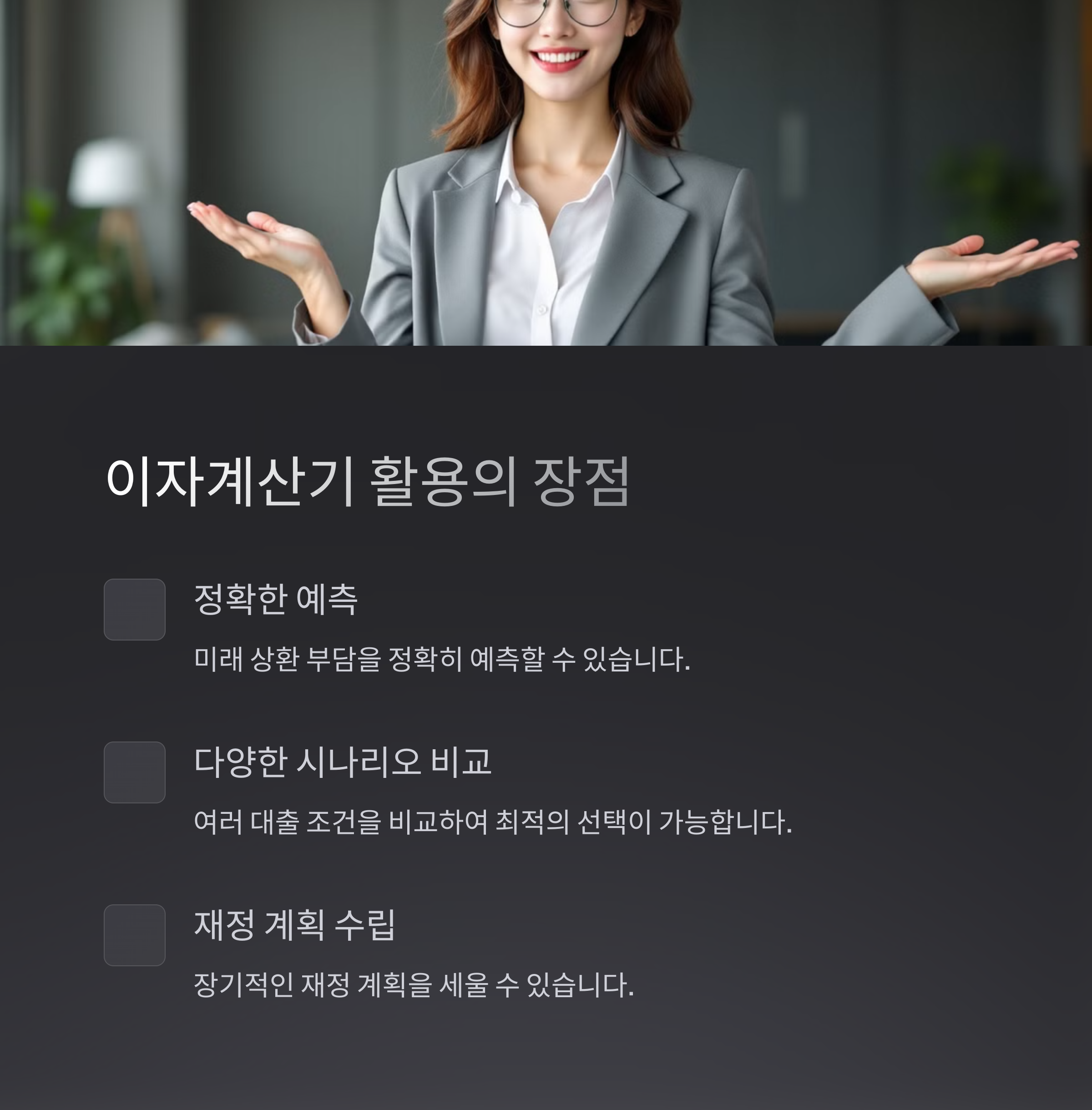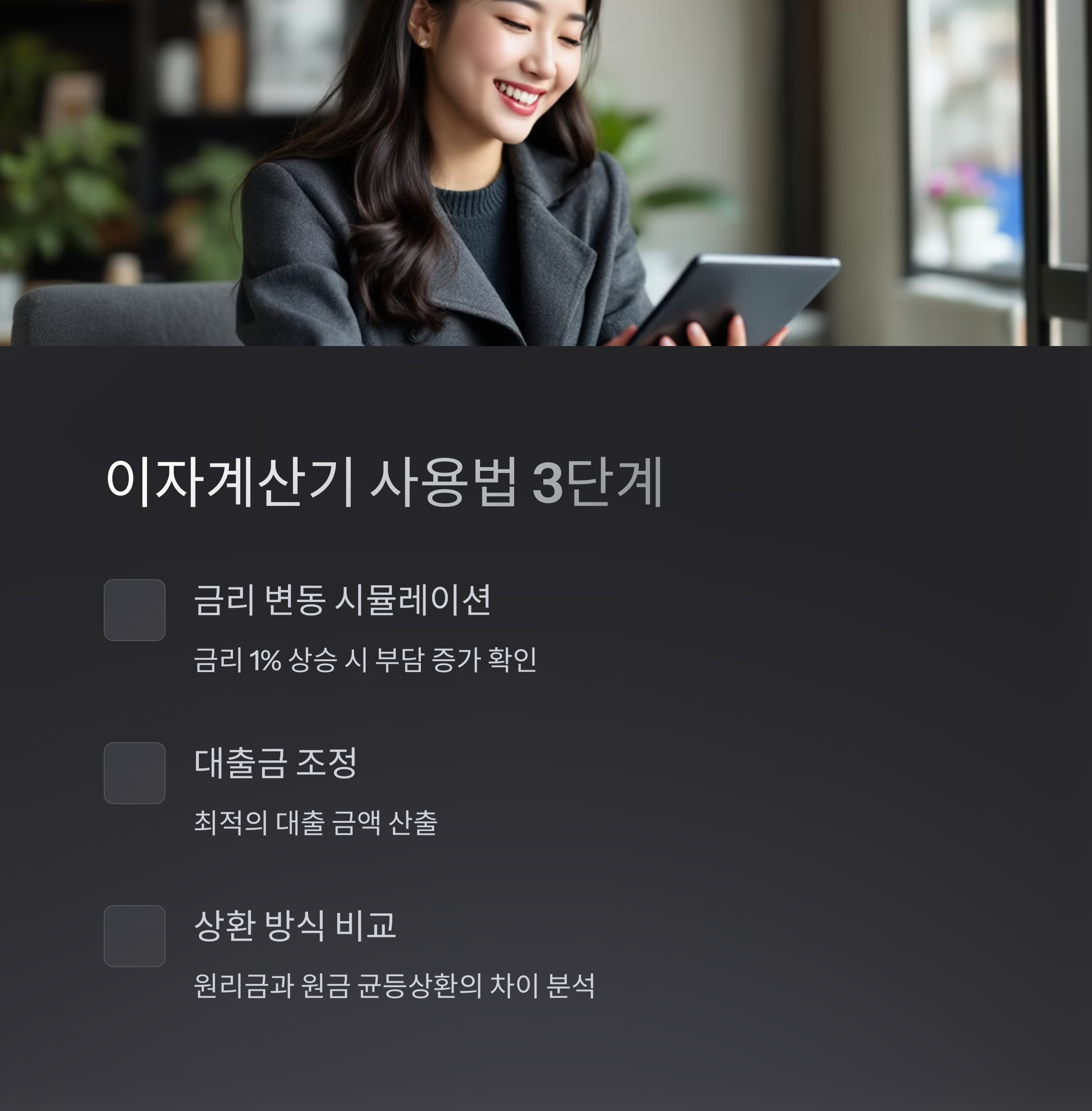 - 금리 변동 시뮬레이션: 금리가 1% 상승하면 얼마나 부담이 증가할지 확인